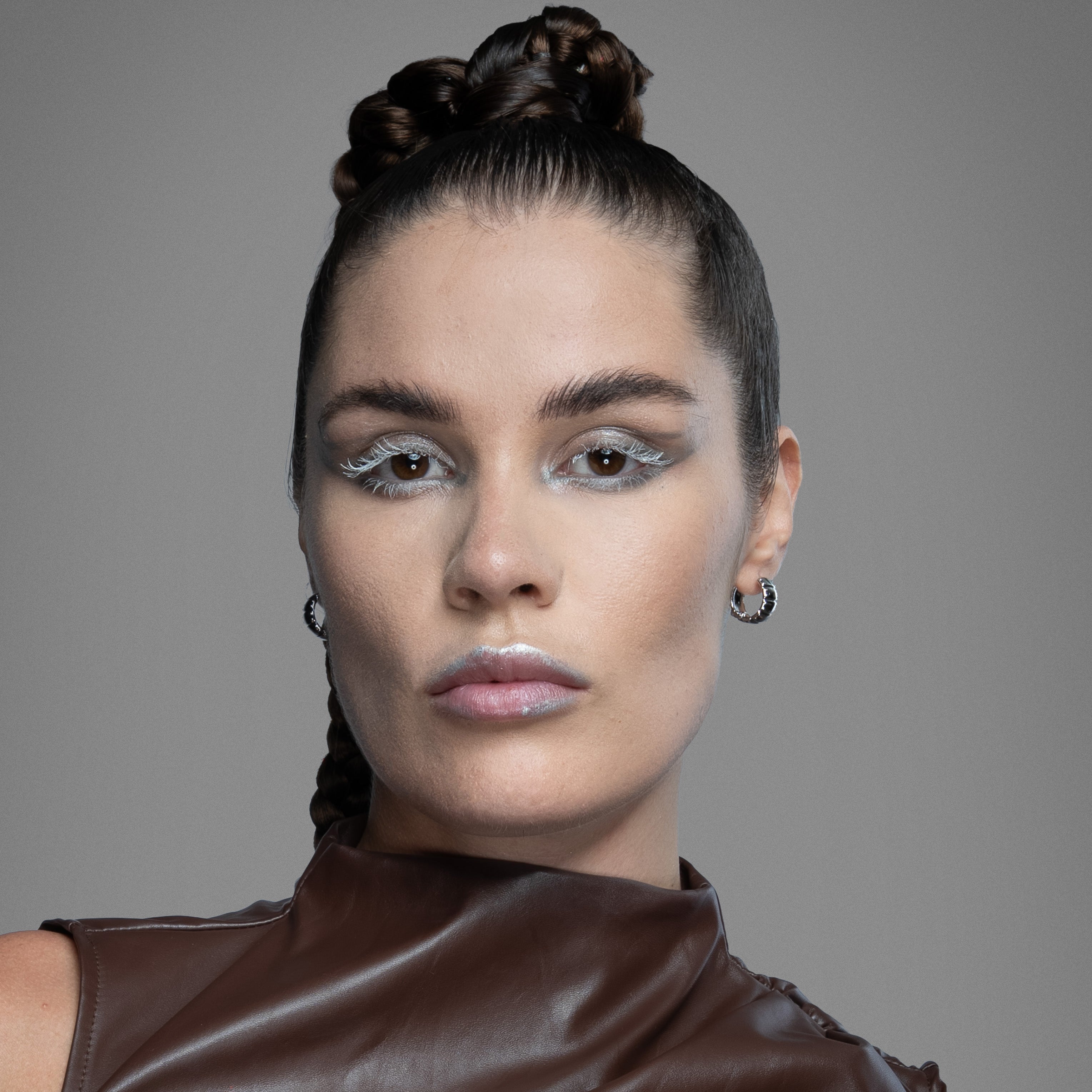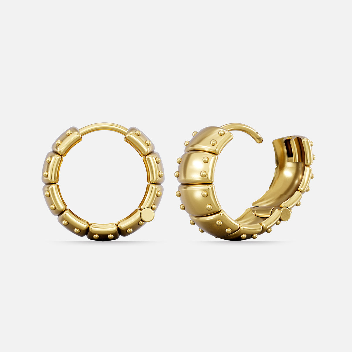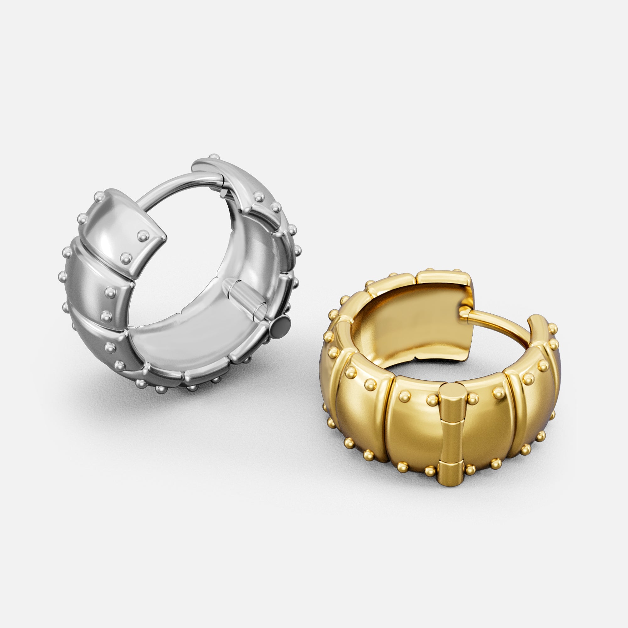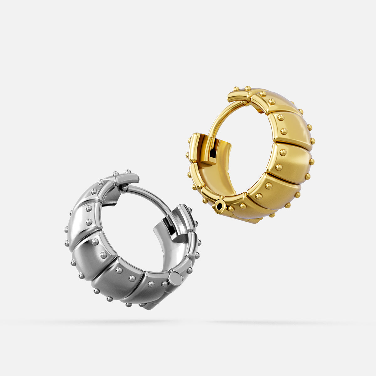 The Laminar Armor Hoop Earrings layer overlapping plates in the logic of armor—each seam disciplined, each edge seated flush. Mass gathers in the arc, but the form stays balanced, structured, and close to the lobe.