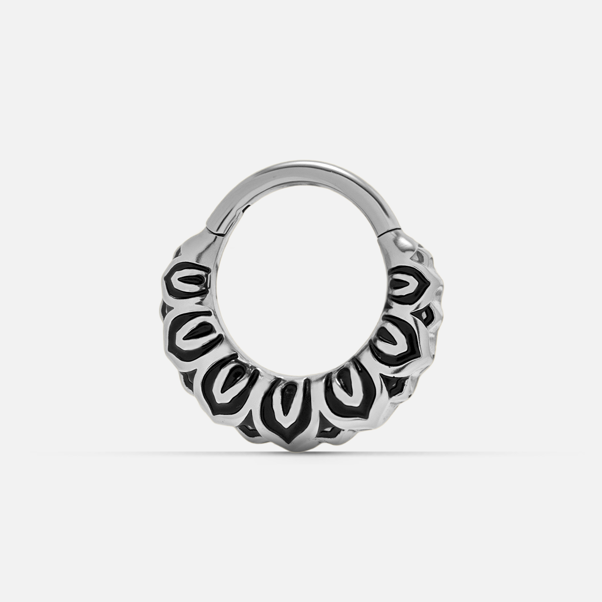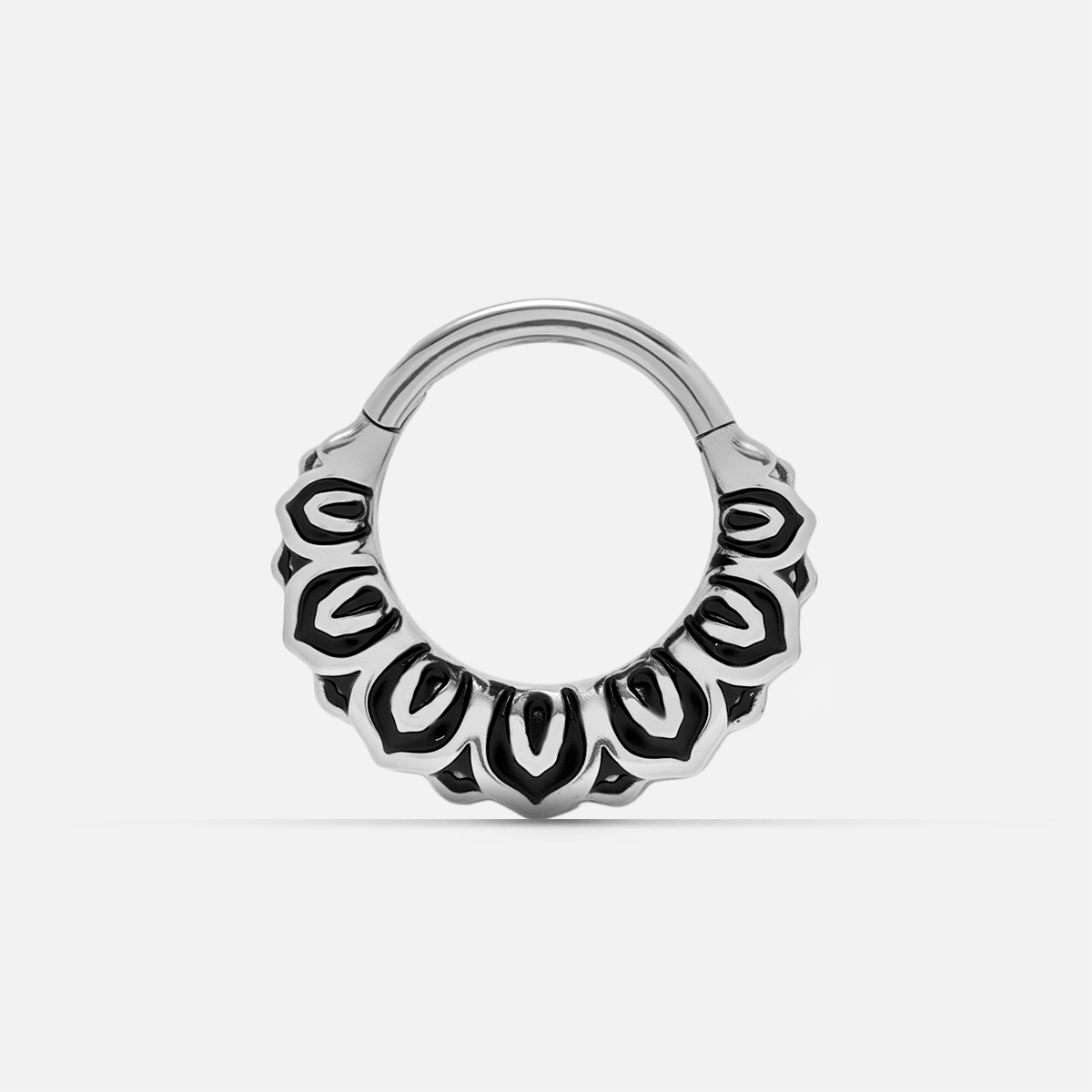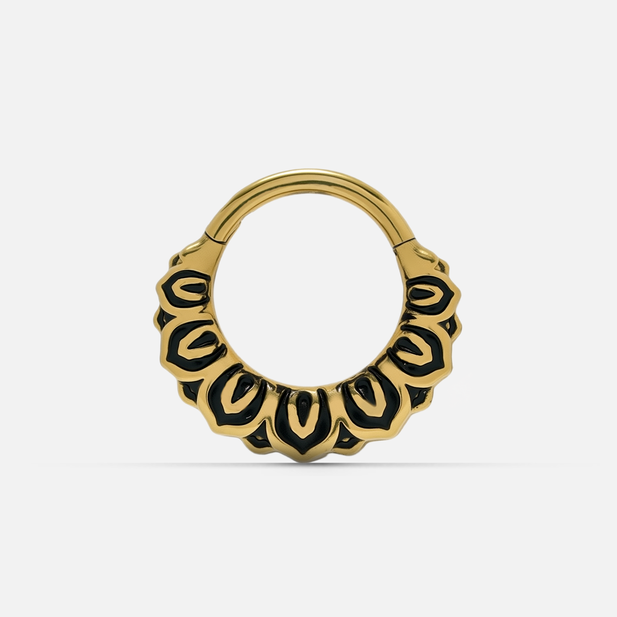 Lotus Bloom Septum Clicker features a bold crescent adorned with petal-like motifs and black enamel accents, creating a striking ornamental look. This item is sold individually.
