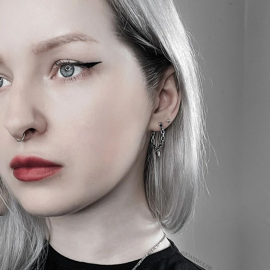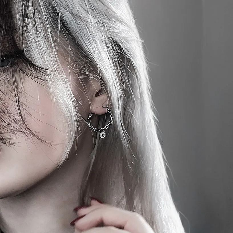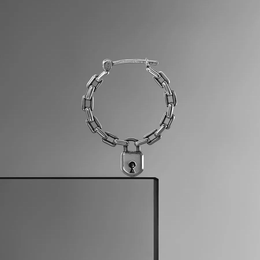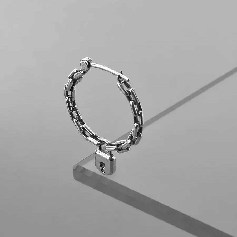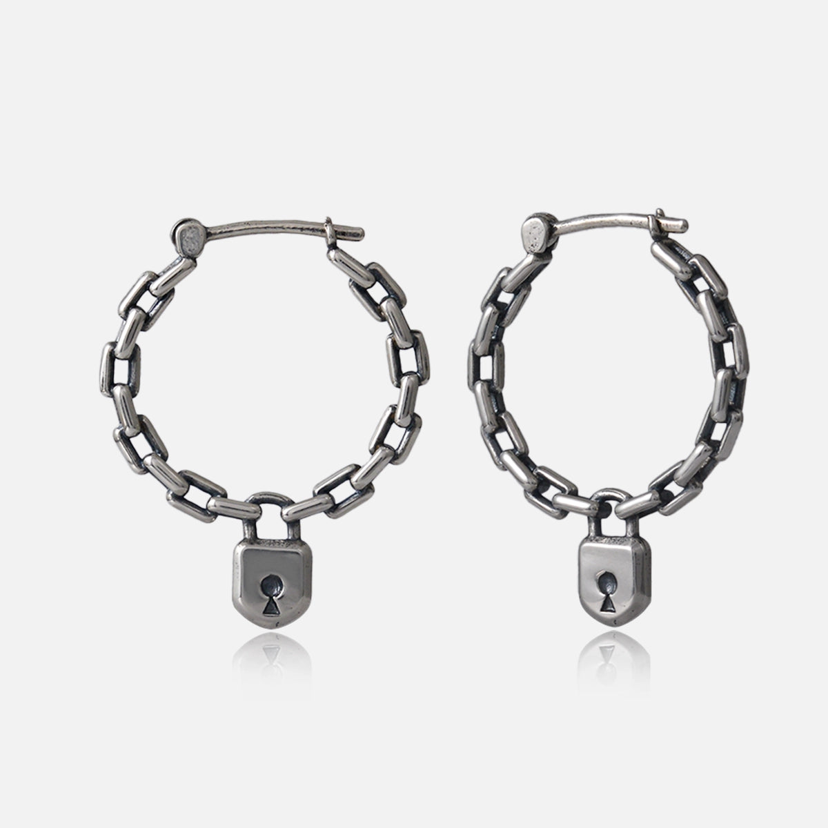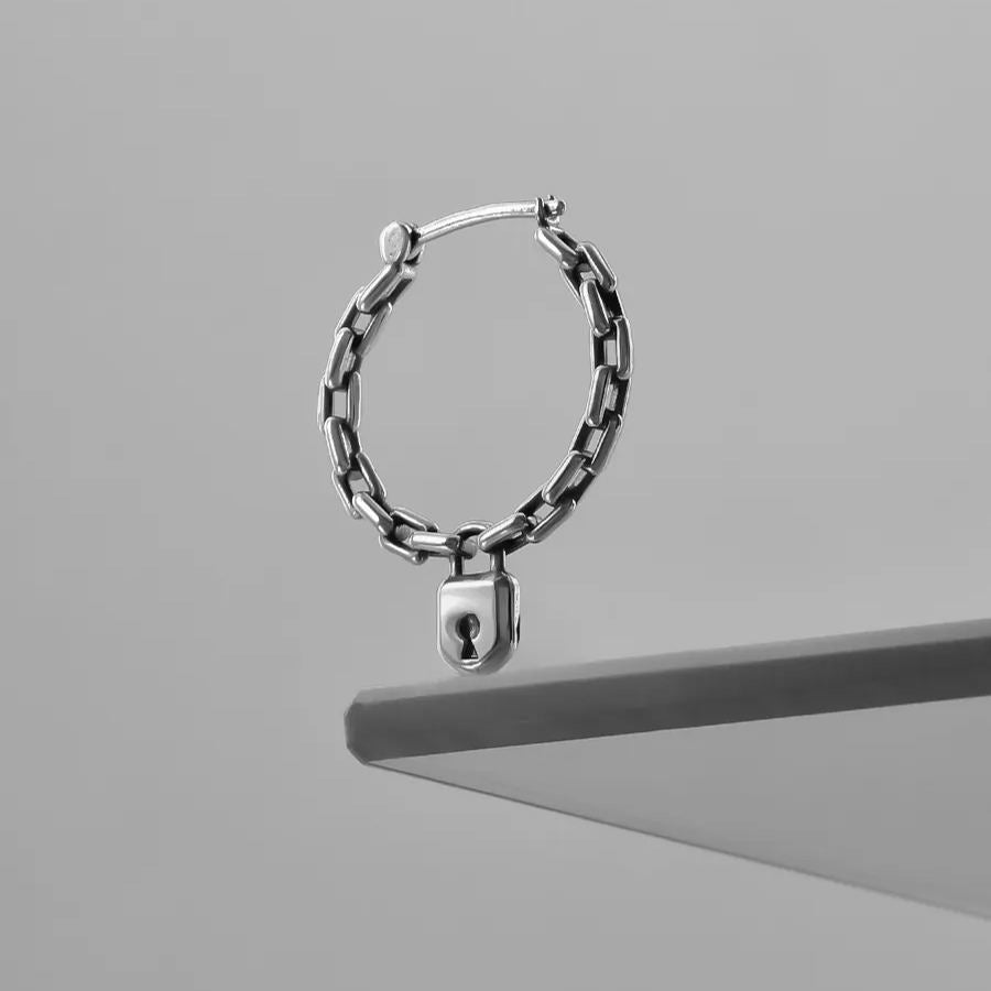 The earrings feature a chain design with a hanging padlock, creating a bold and edgy look. This item is sold as a pair.
