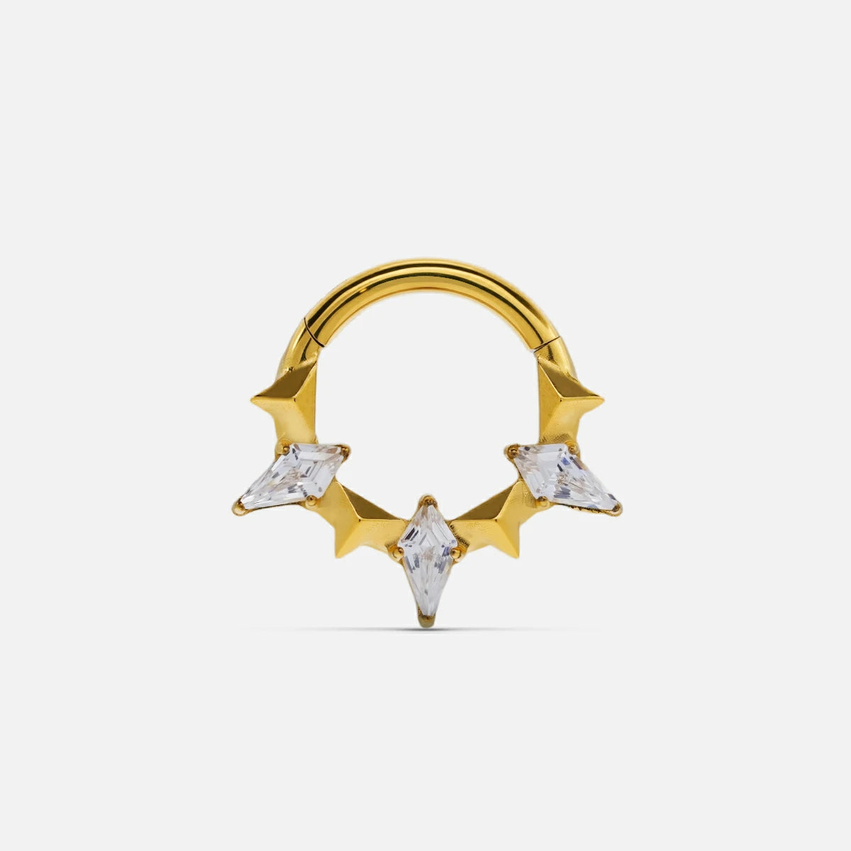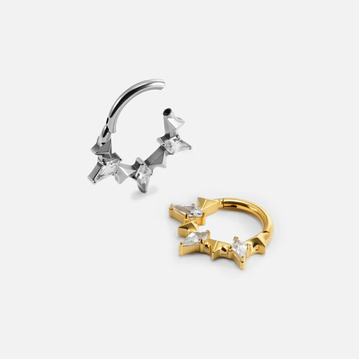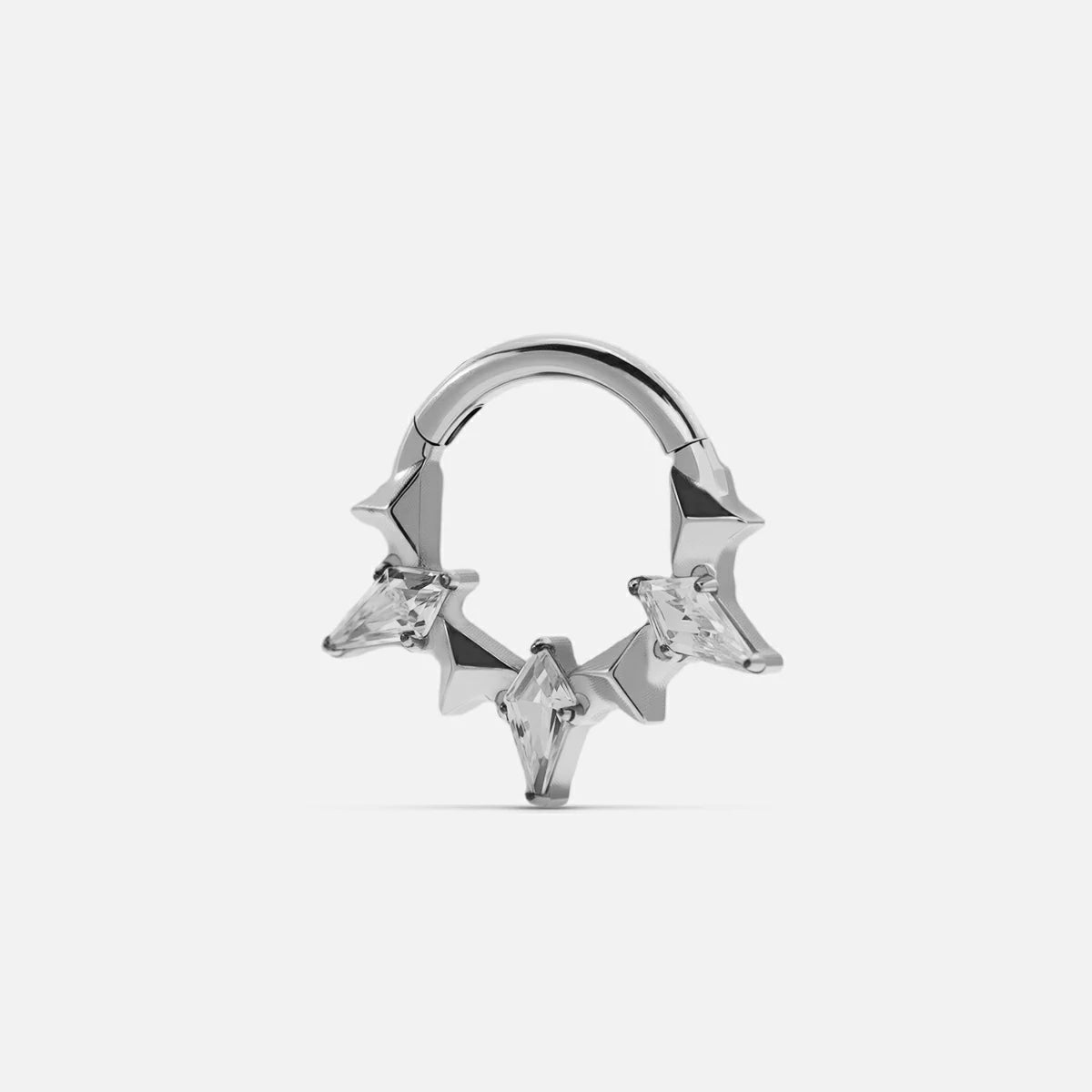 Minimal Prism Septum Clicker features a sleek metallic arc adorned with rhombus-shaped cubic zirconia stones, creating a refined geometric silhouette. This item is sold individually.
