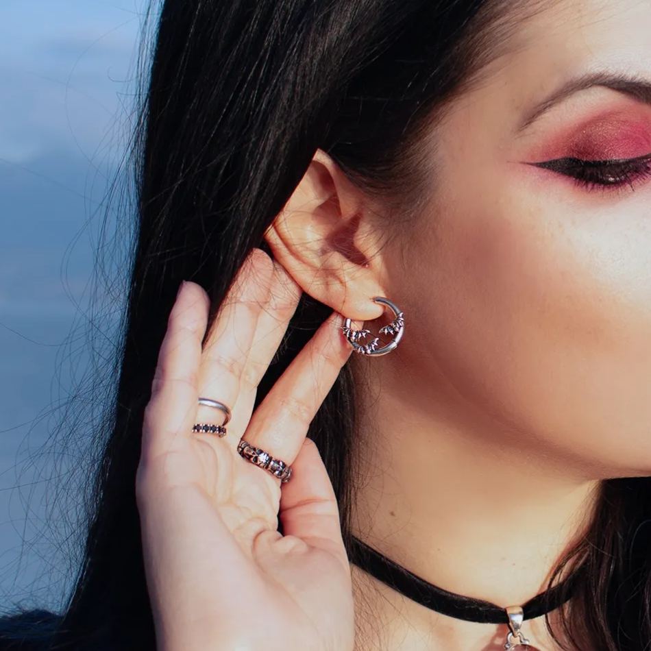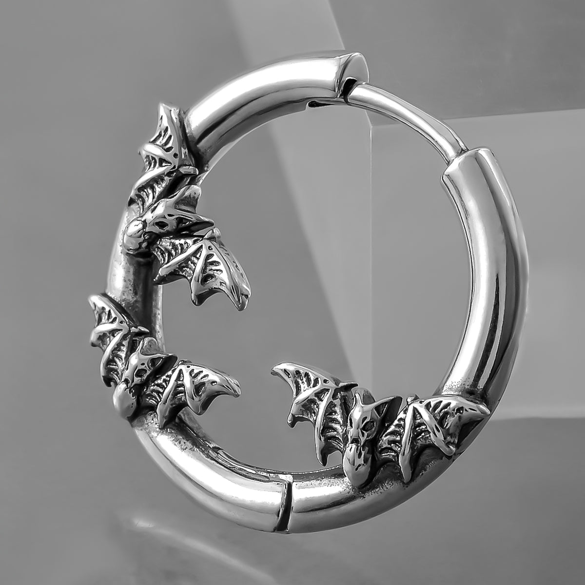 The earrings feature intricately detailed bat motifs wrapped around a circular hoop, creating a mysterious and striking look. This item is sold as a pair.