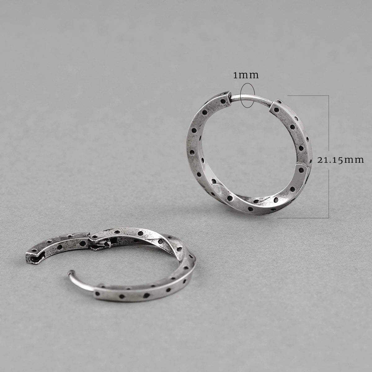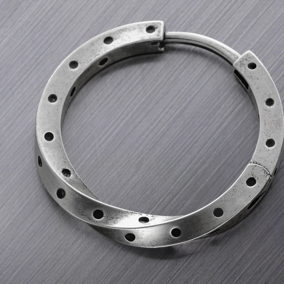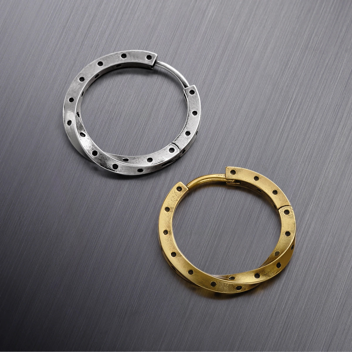 These earrings feature a sleek, modern hoop design with evenly spaced perforations for a unique texture. This item is sold as a pair.