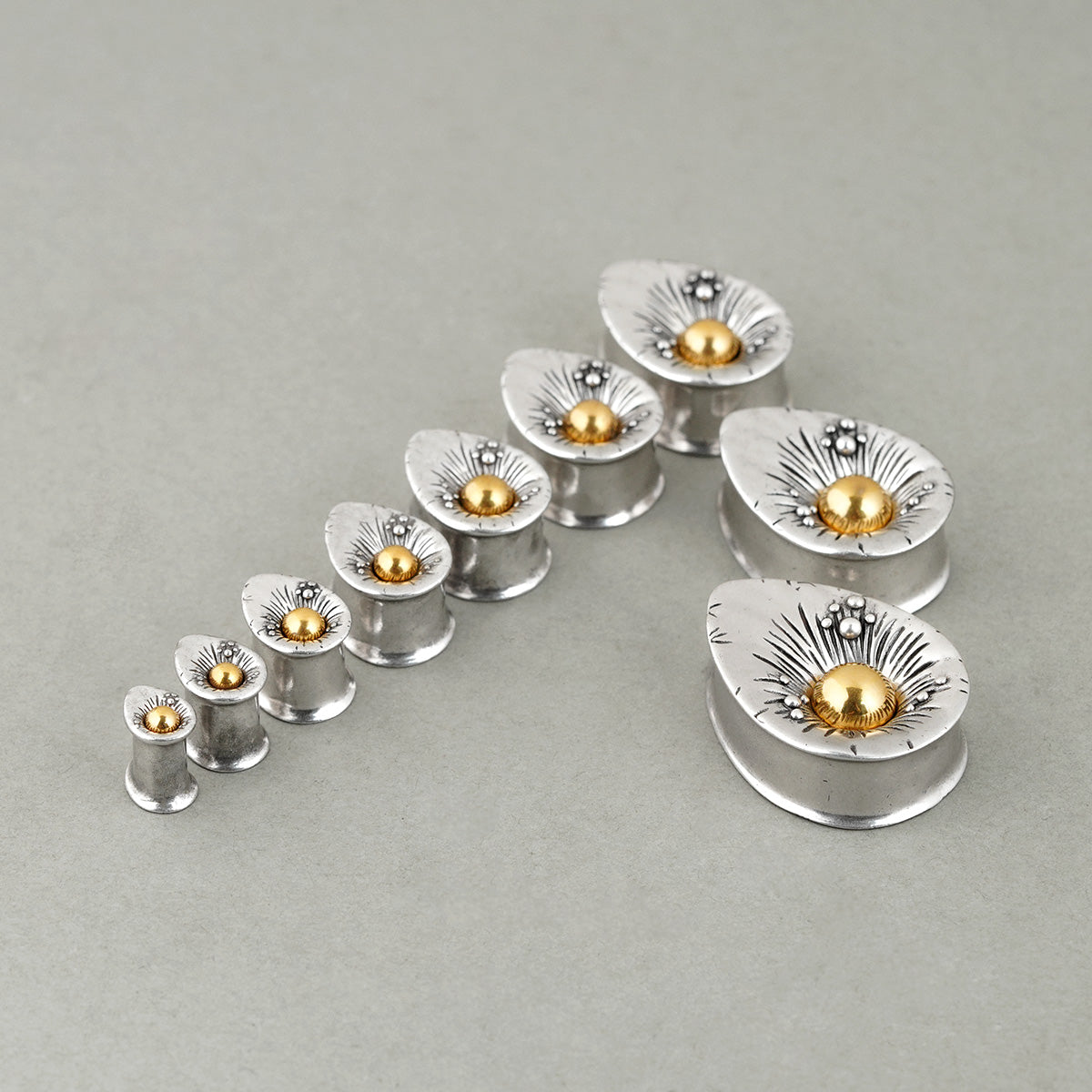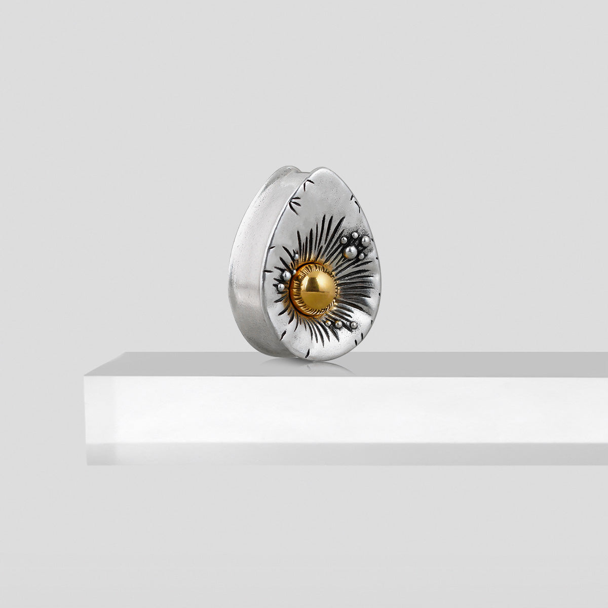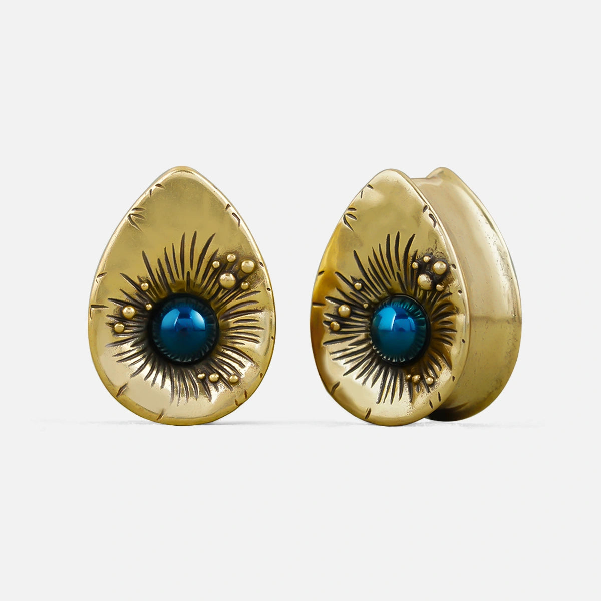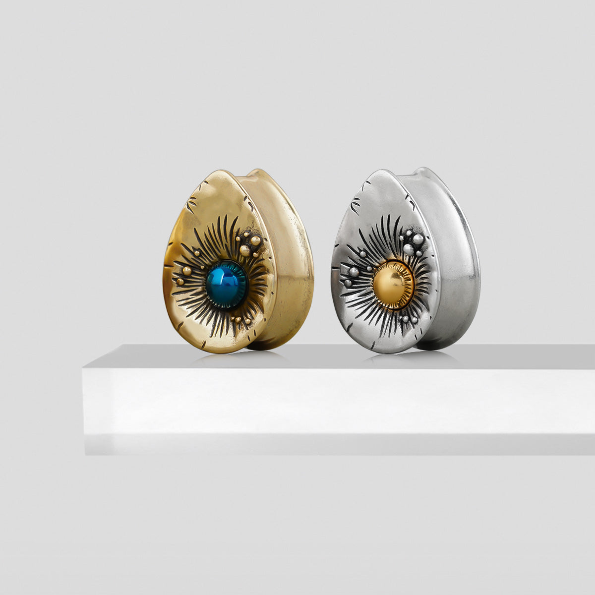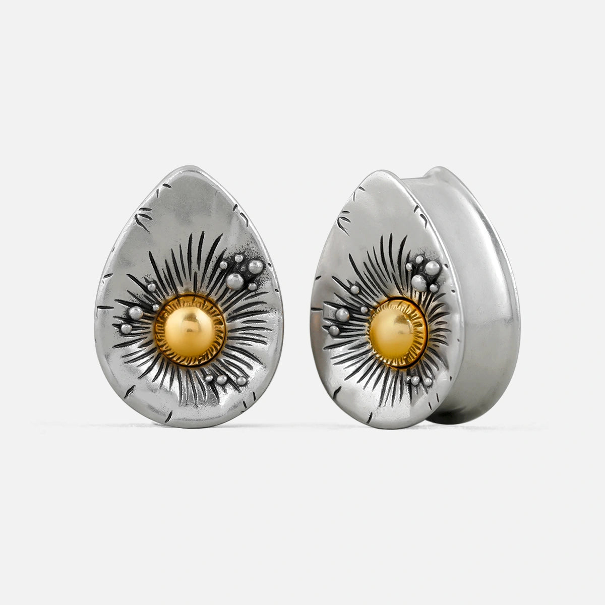Our Radiant Sunburst Plugs feature a teardrop shape with a central golden orb, surrounded by intricate sunray and floral patterns, crafted from high-quality metal. This item is sold as a pair.