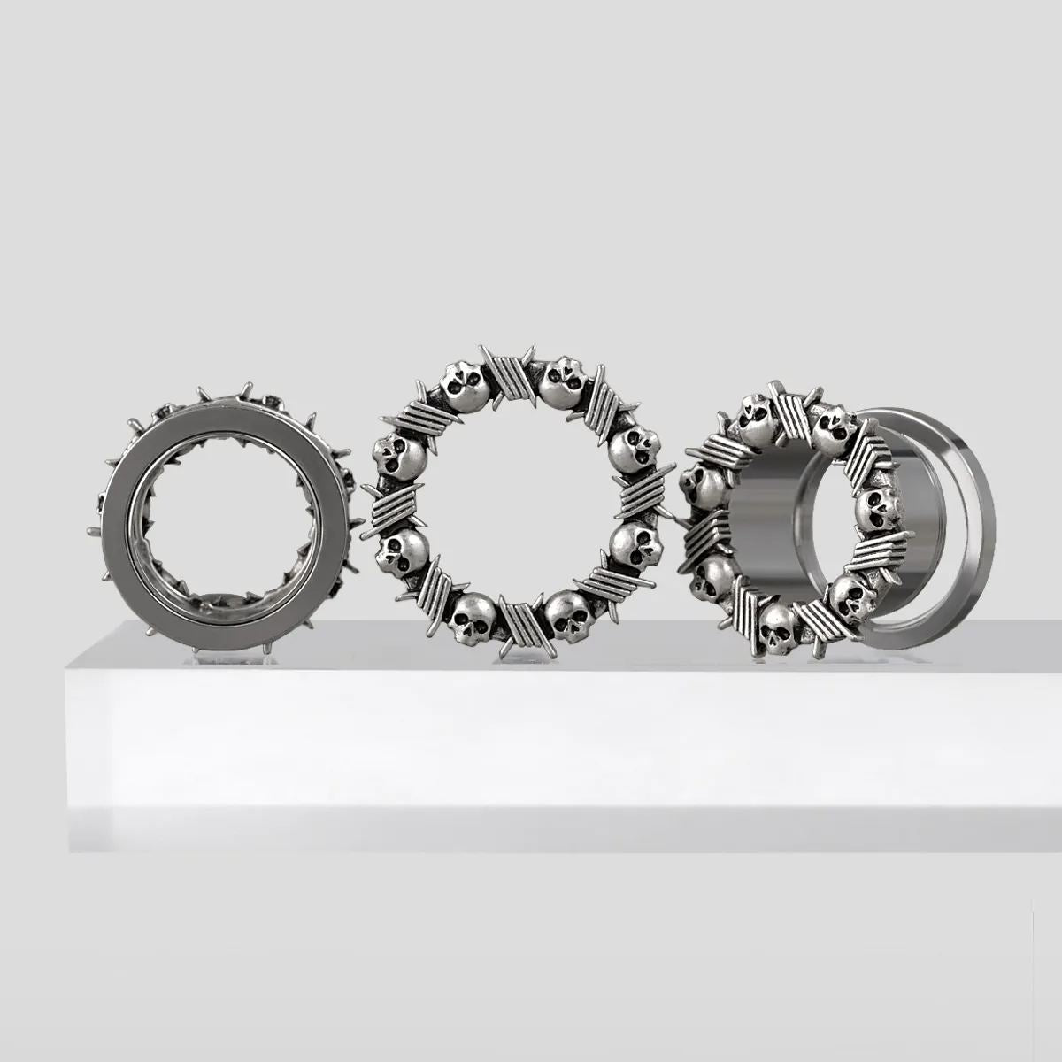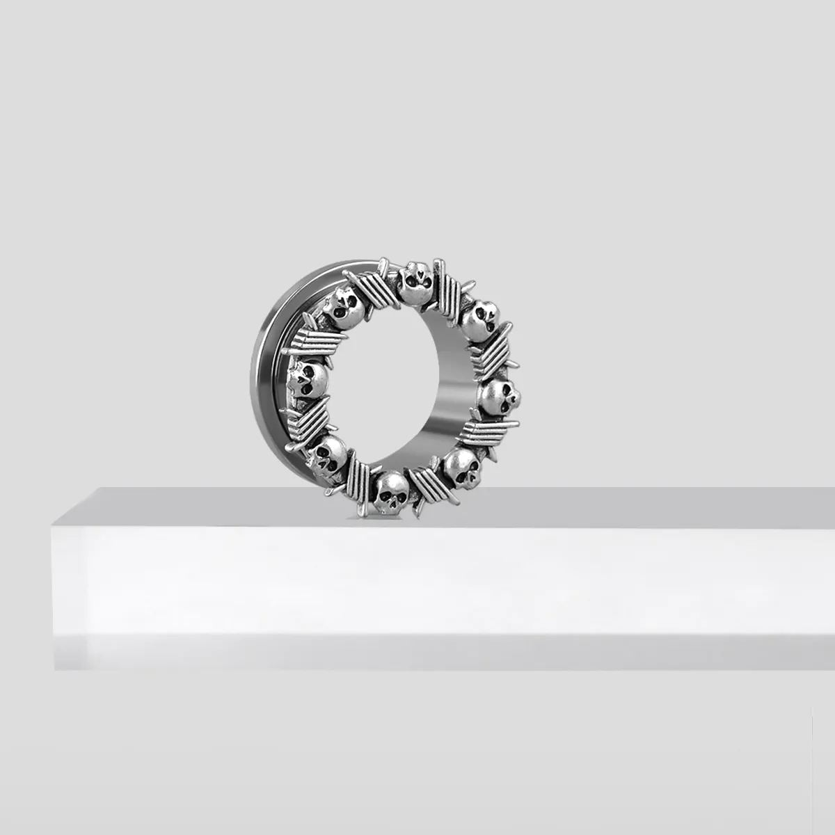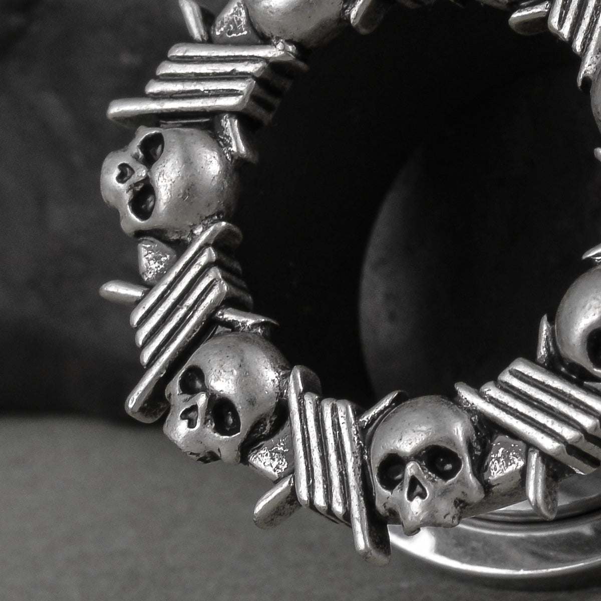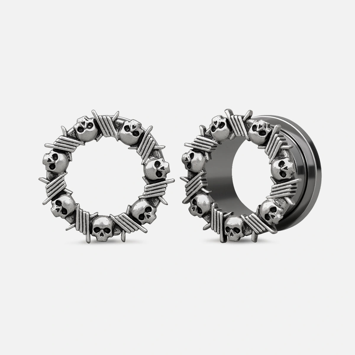 Rebel Skull TUNNELS feature a bold circular design adorned with multiple skulls and barbed wire elements. This item is sold as a pair.
