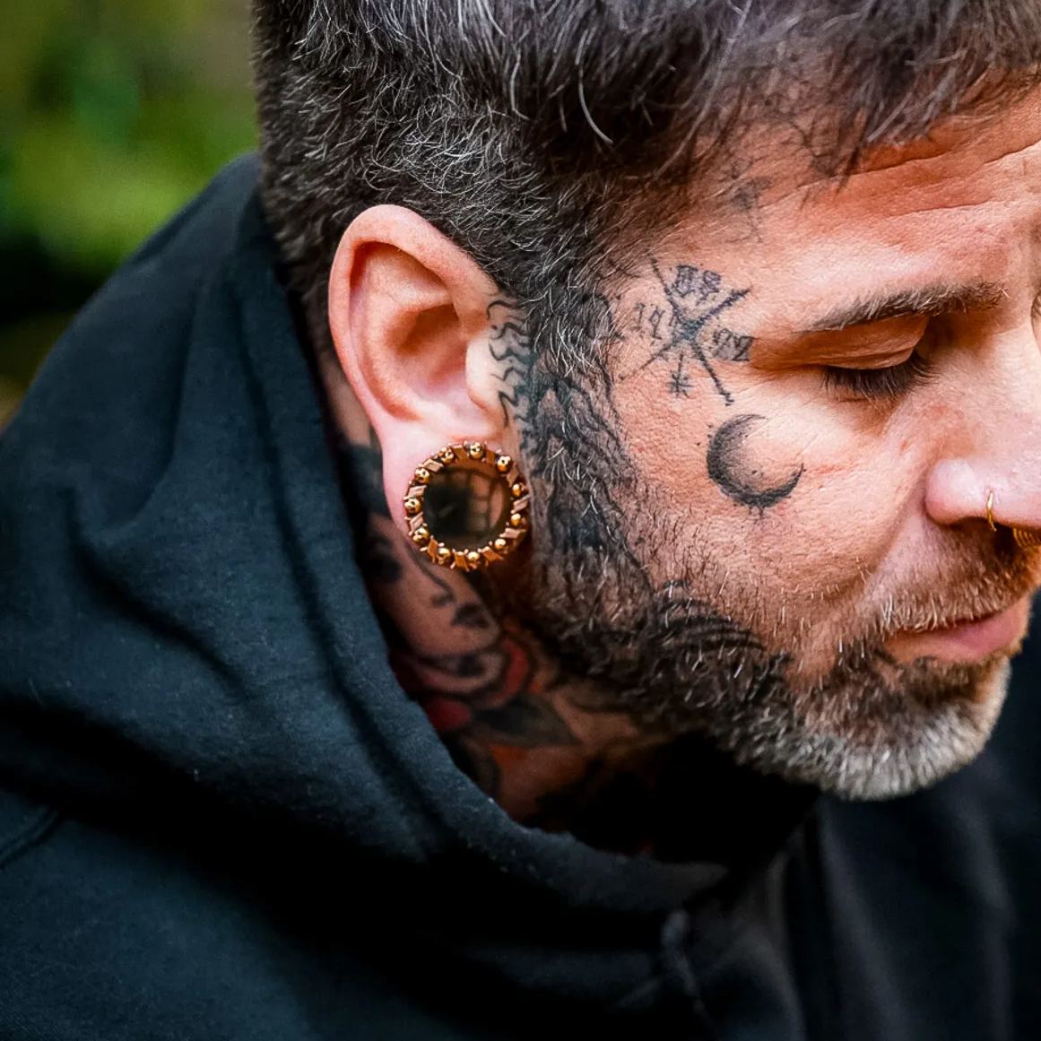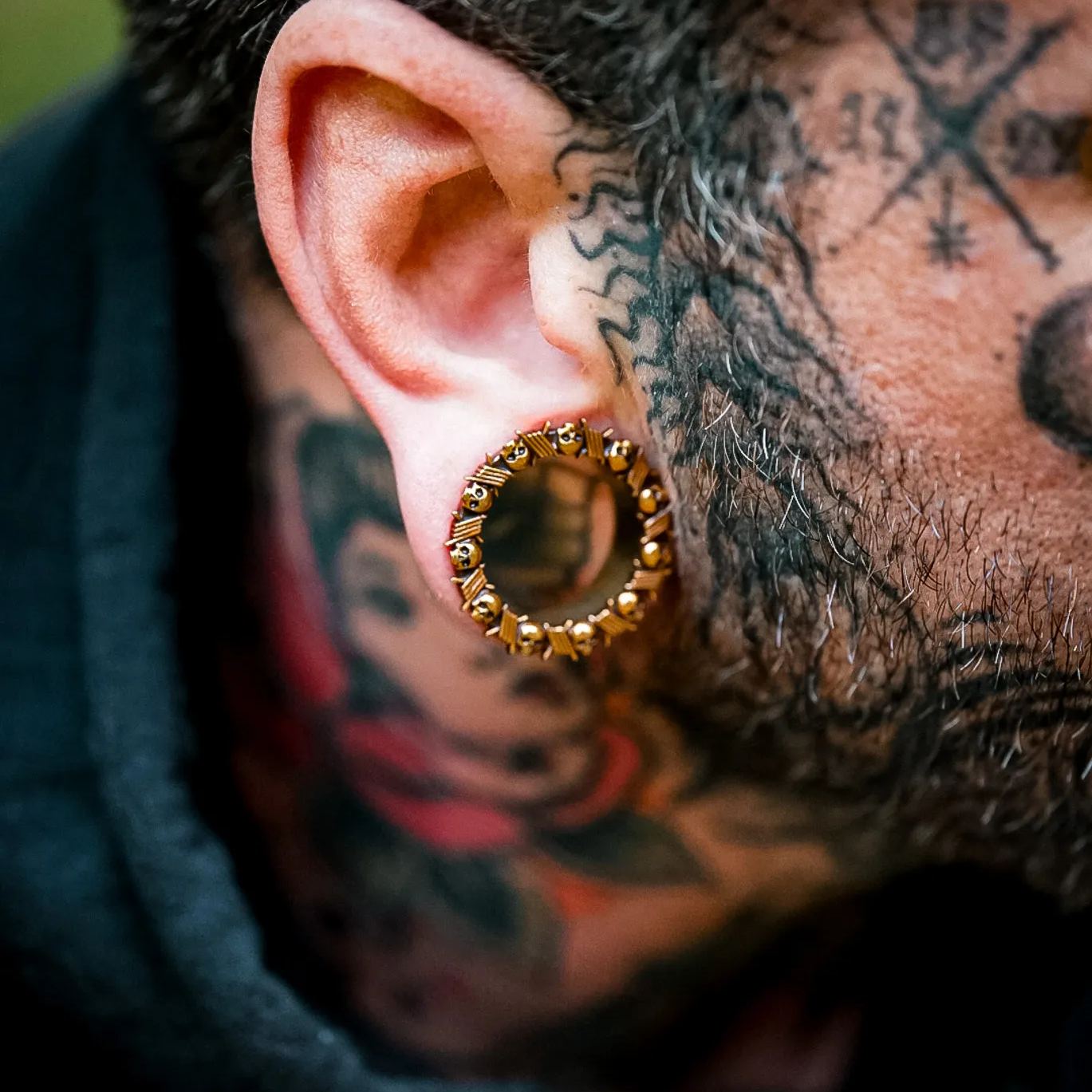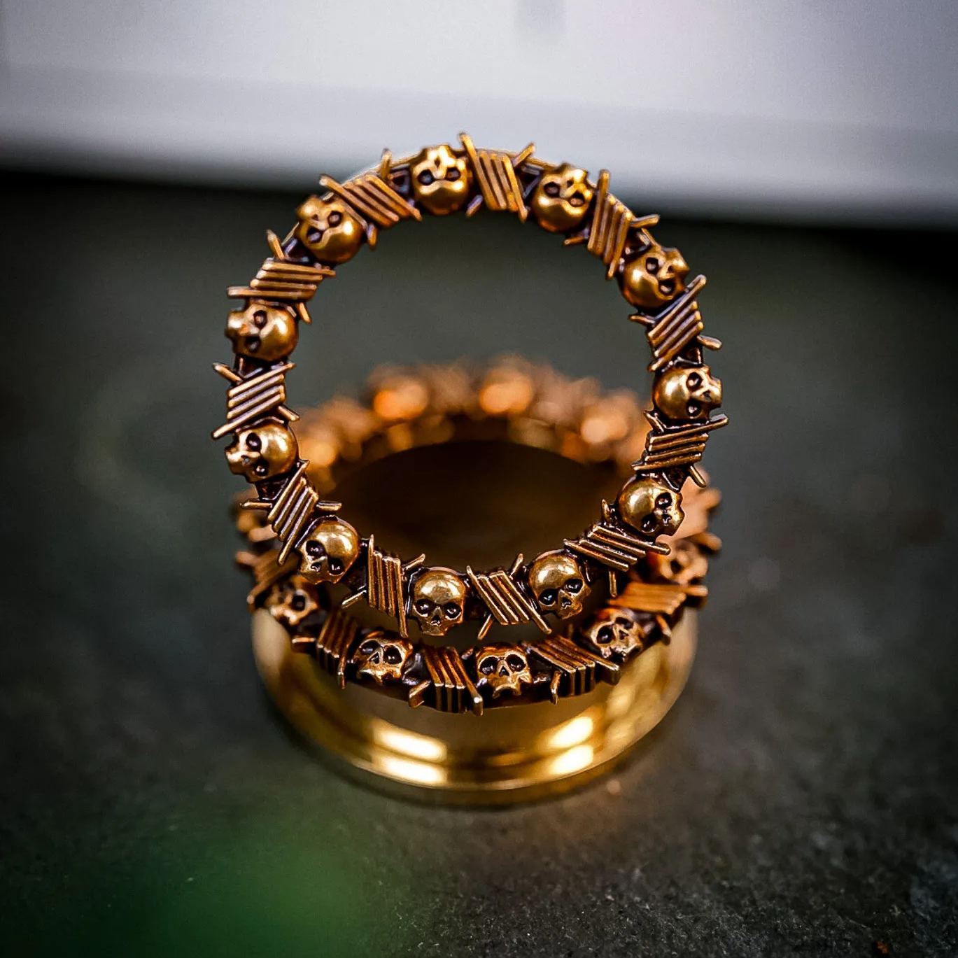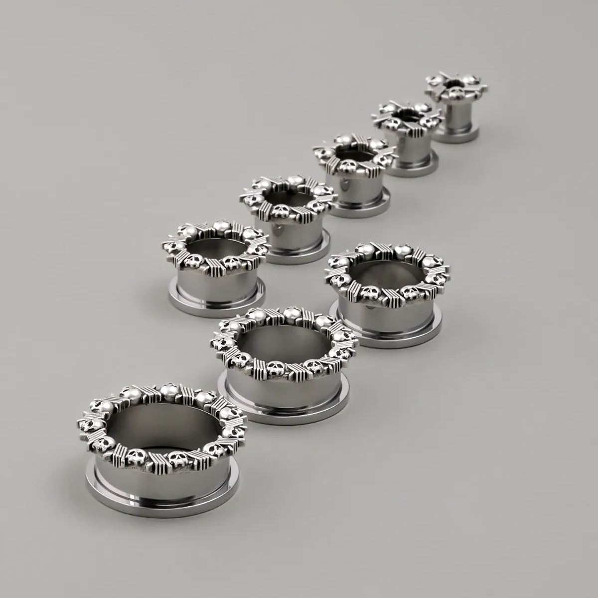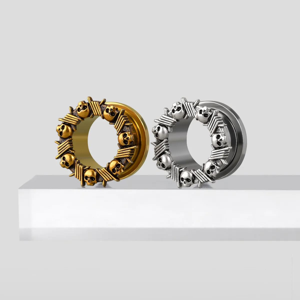 Rebel Skull TUNNELS feature a bold circular design adorned with multiple skulls and barbed wire elements. This item is sold as a pair.