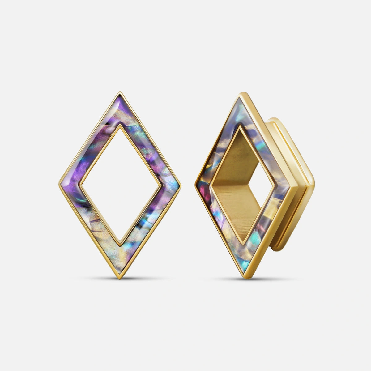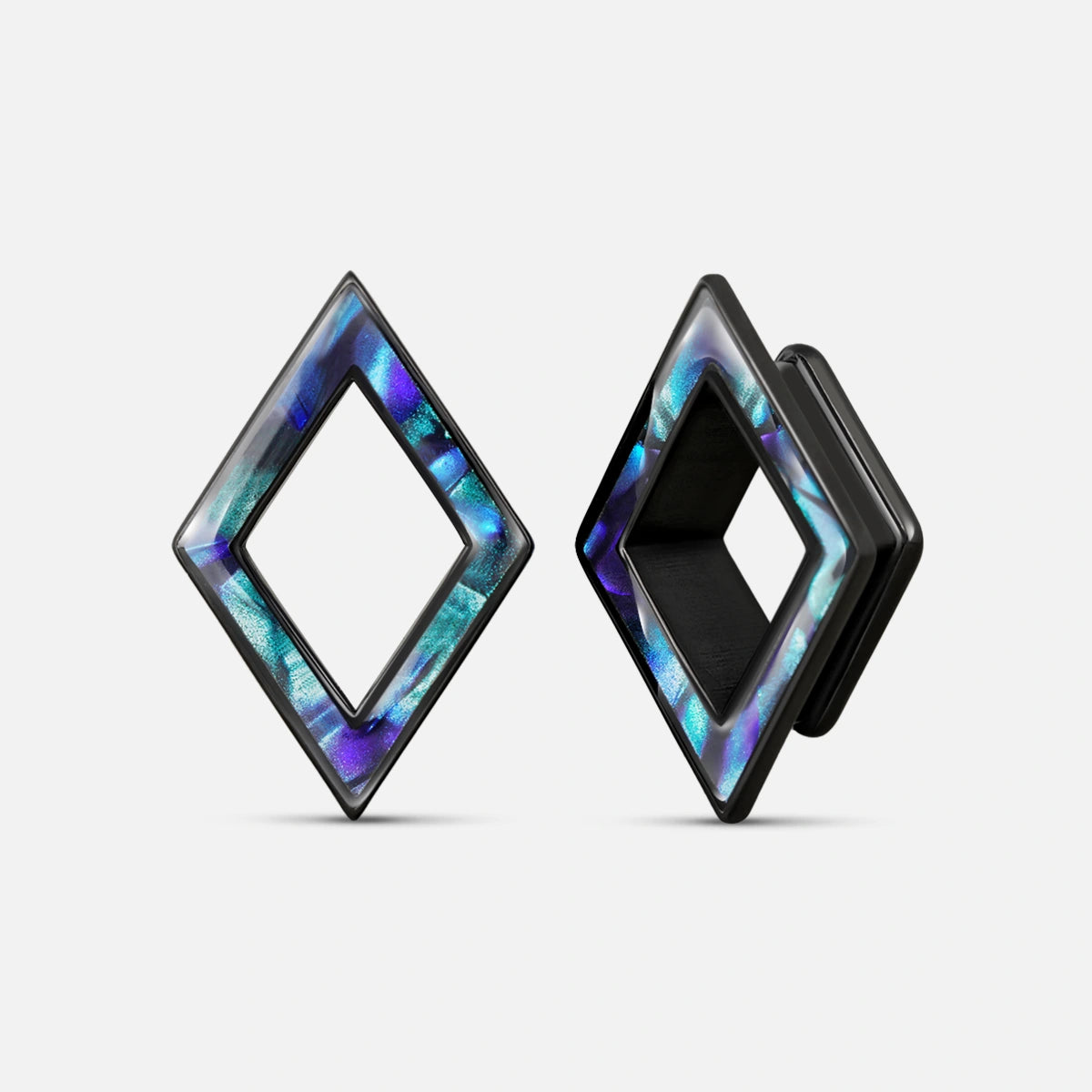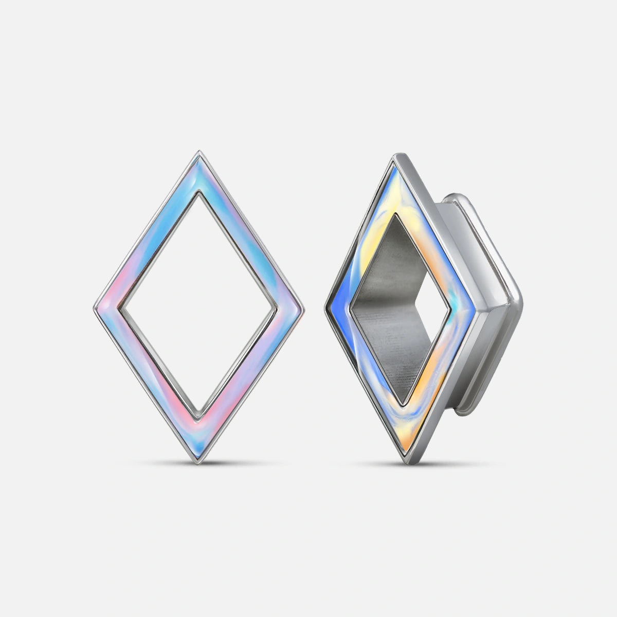 The design features a sleek rhombus shape with an iridescent finish that changes color at different angles, creating a captivating visual effect. This item is sold as a pair.