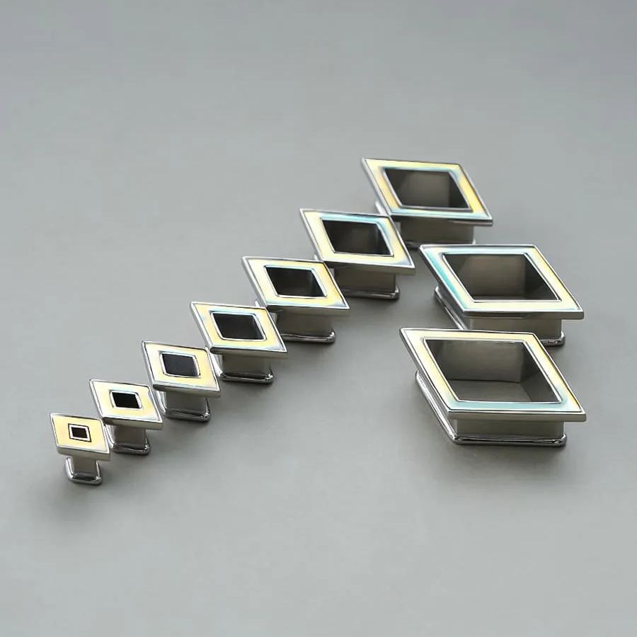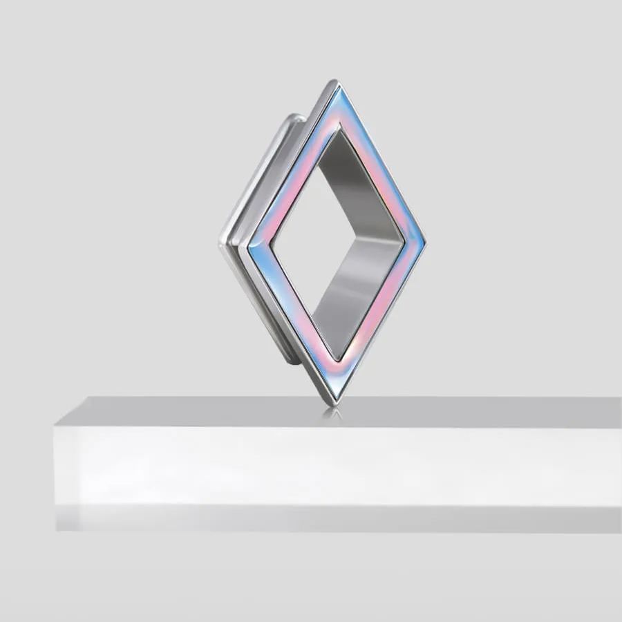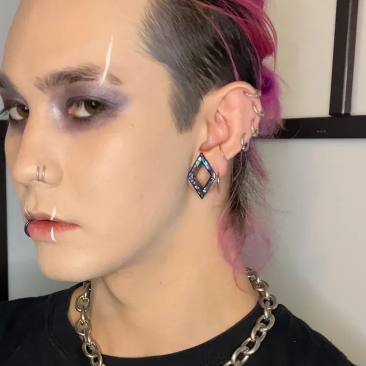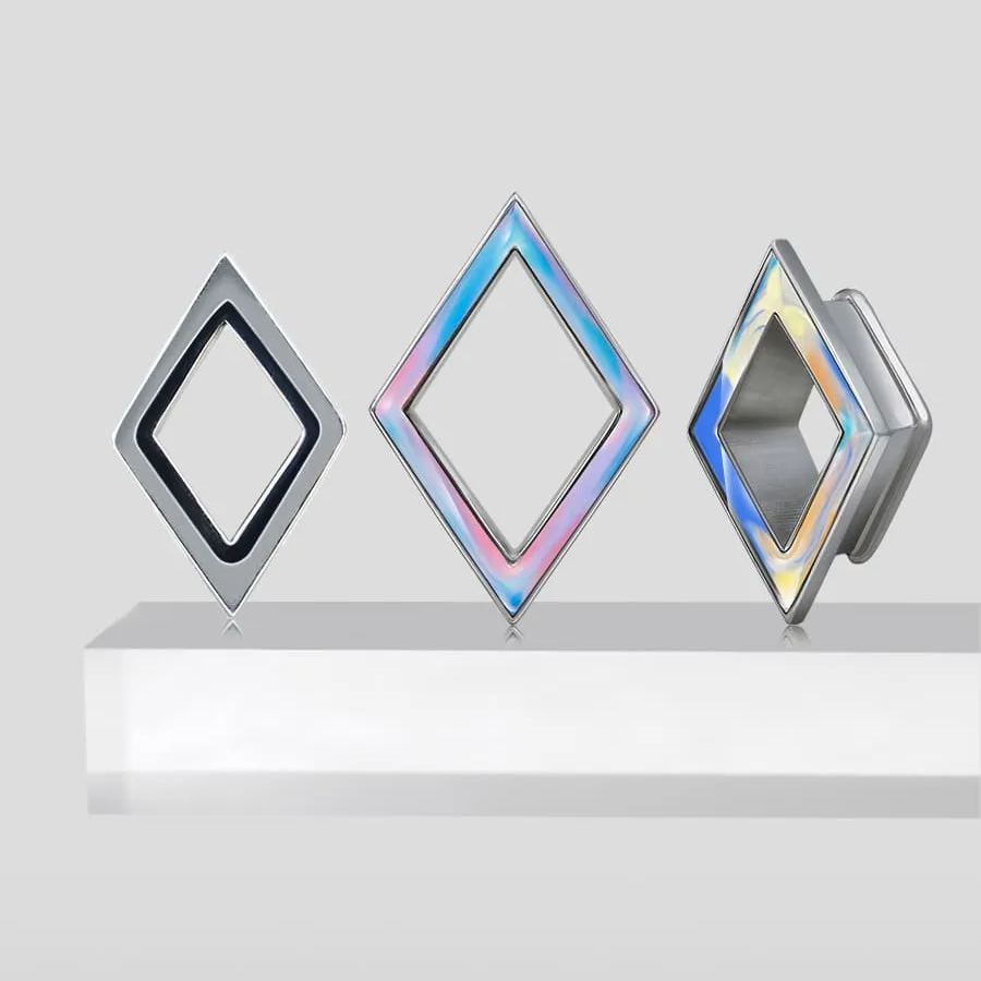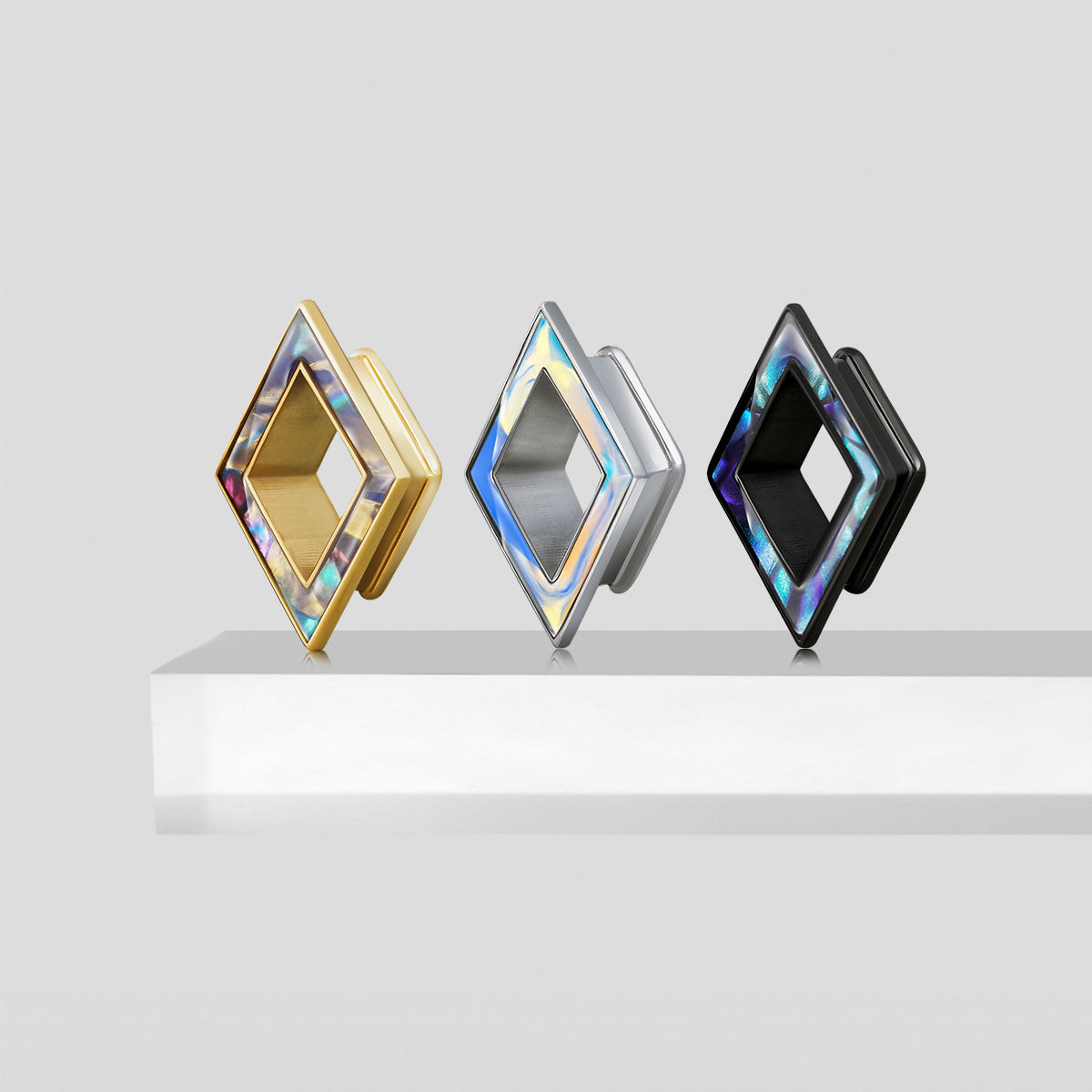 The design features a sleek rhombus shape with an iridescent finish that changes color at different angles, creating a captivating visual effect. This item is sold as a pair.