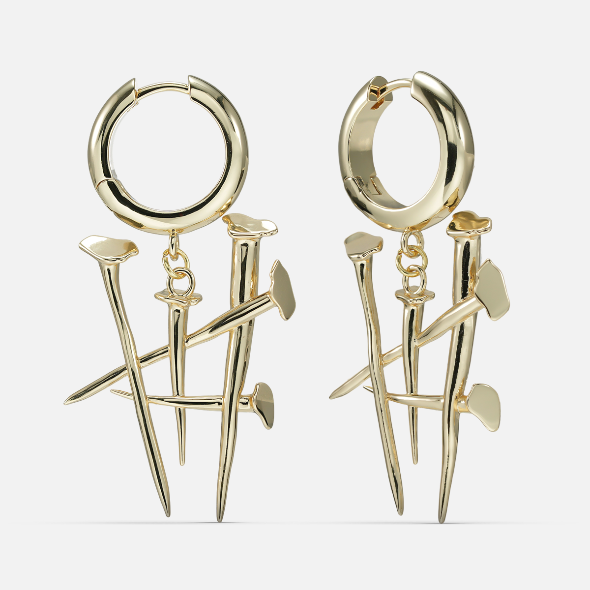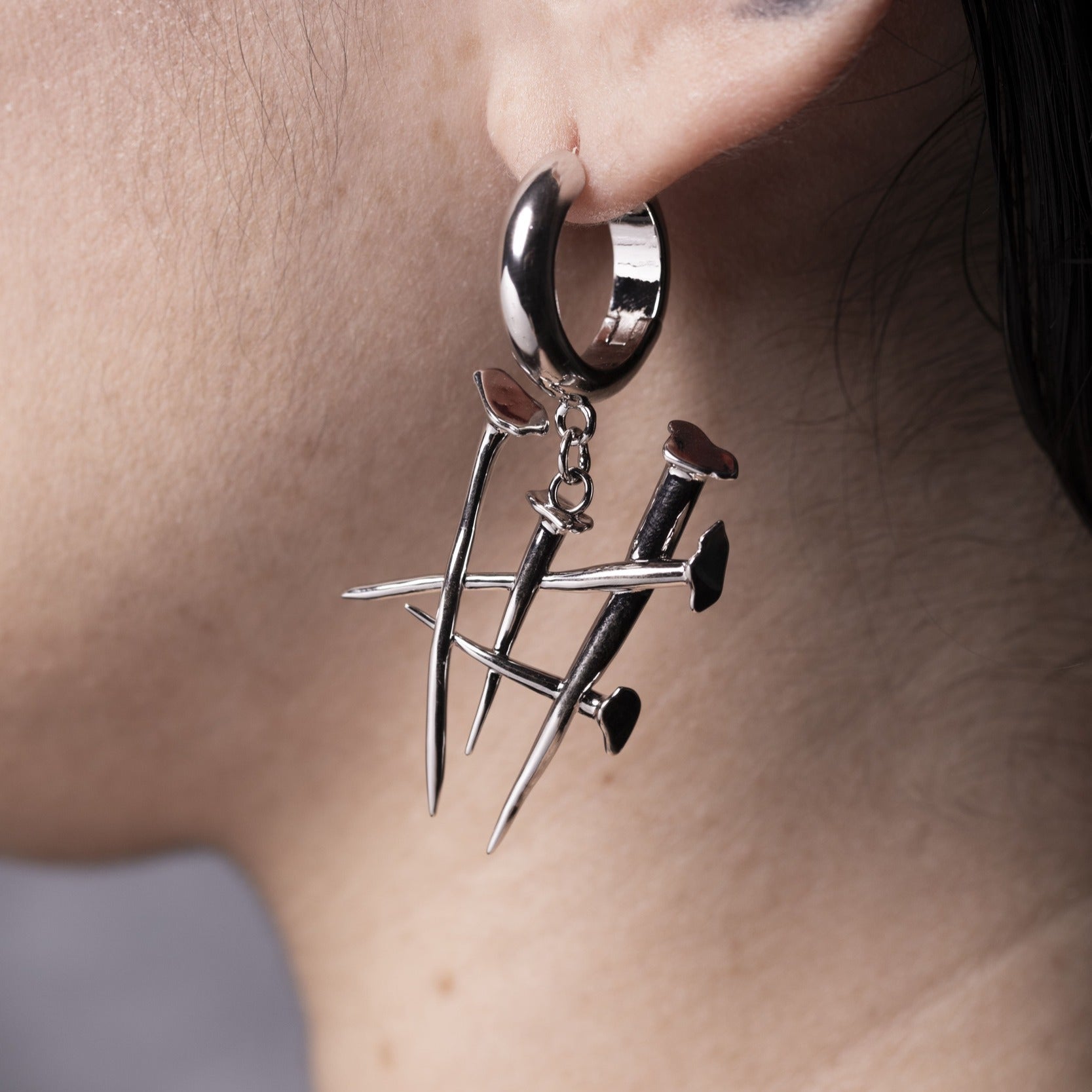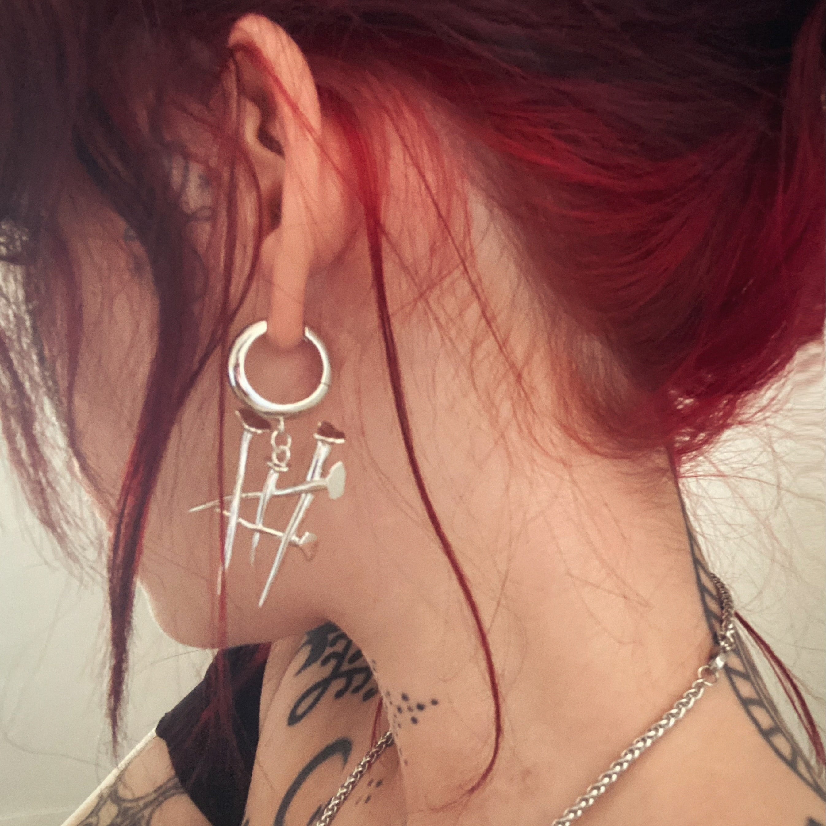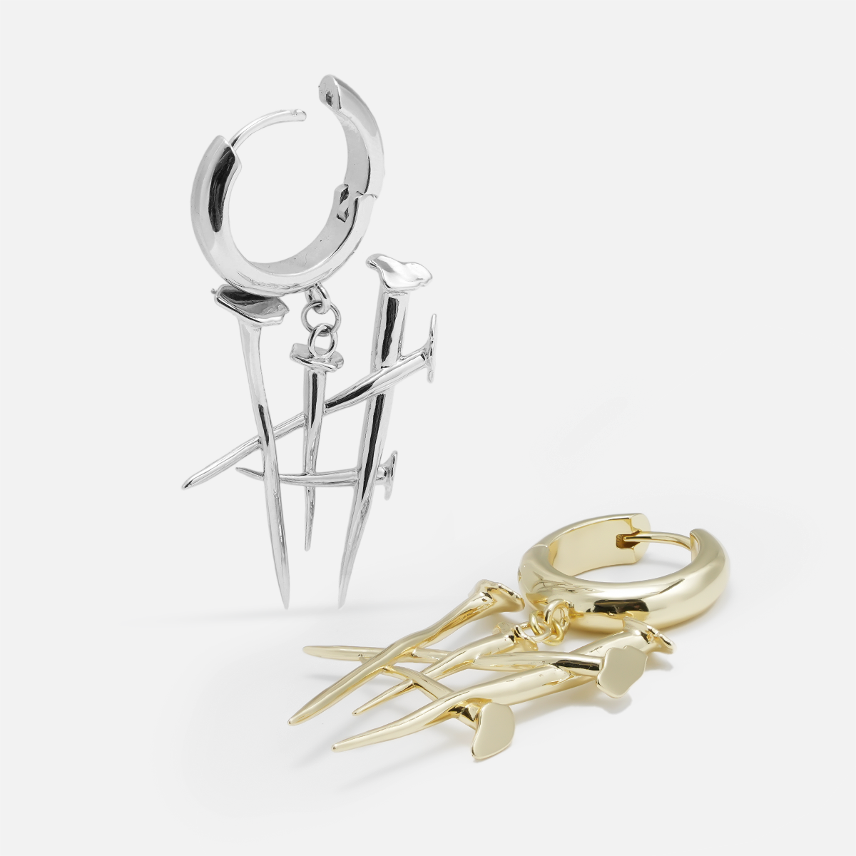 The Ritual Nails Earrings feature a striking nail-inspired design, blending industrial aesthetics with contemporary art for a bold statement. This item is sold as a pair.