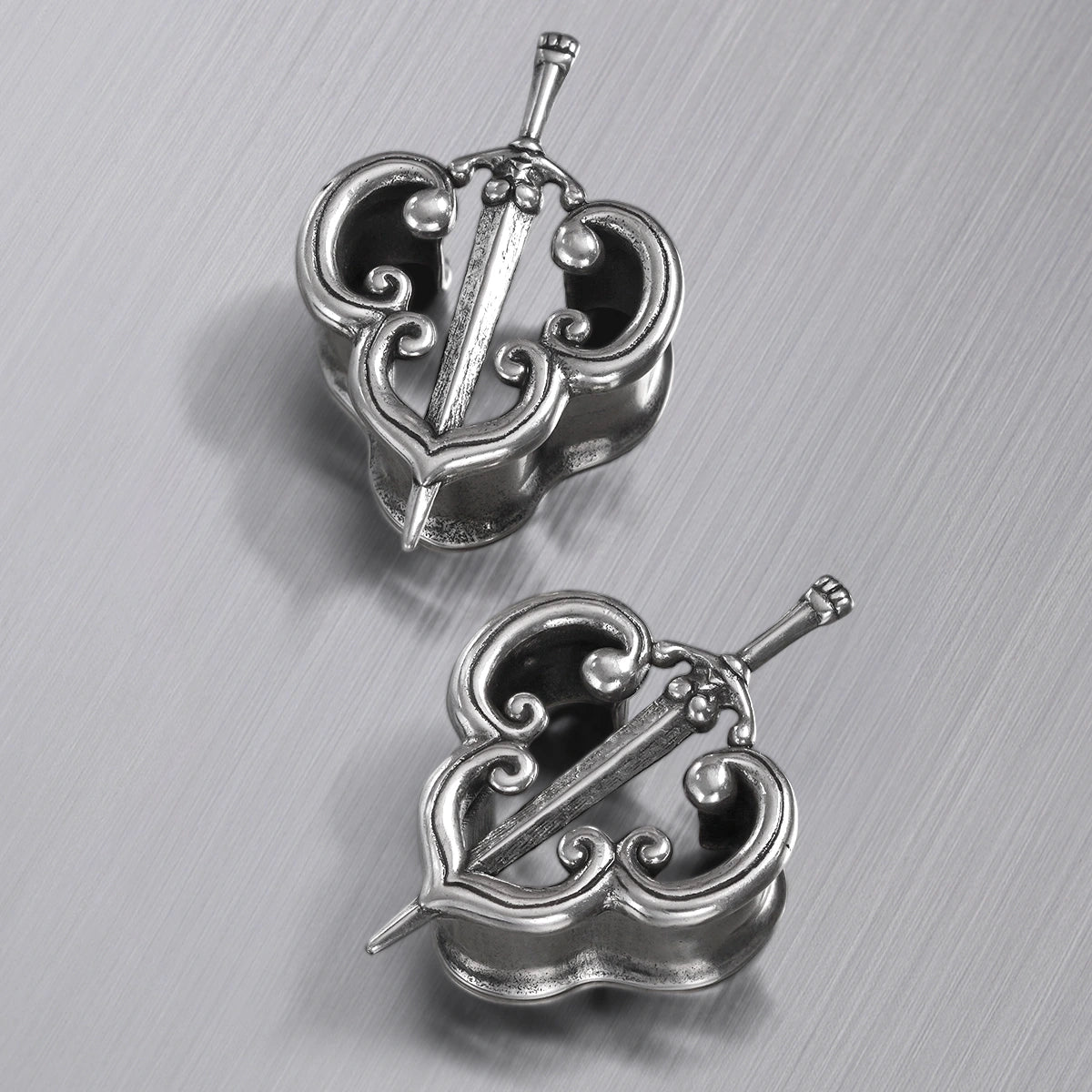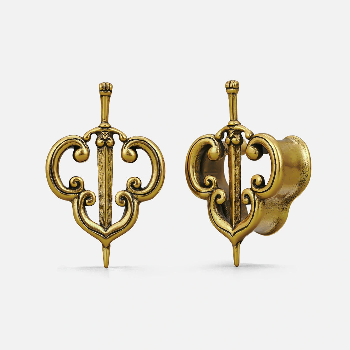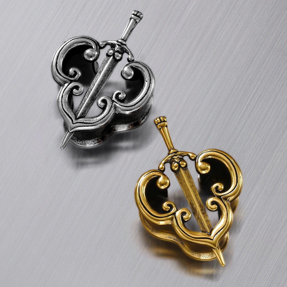 Crafted in antique silver and gold tone, these tunnels feature a sacred sword set within a baroque-style crest, merging power and elegance. This item is sold as a pair.