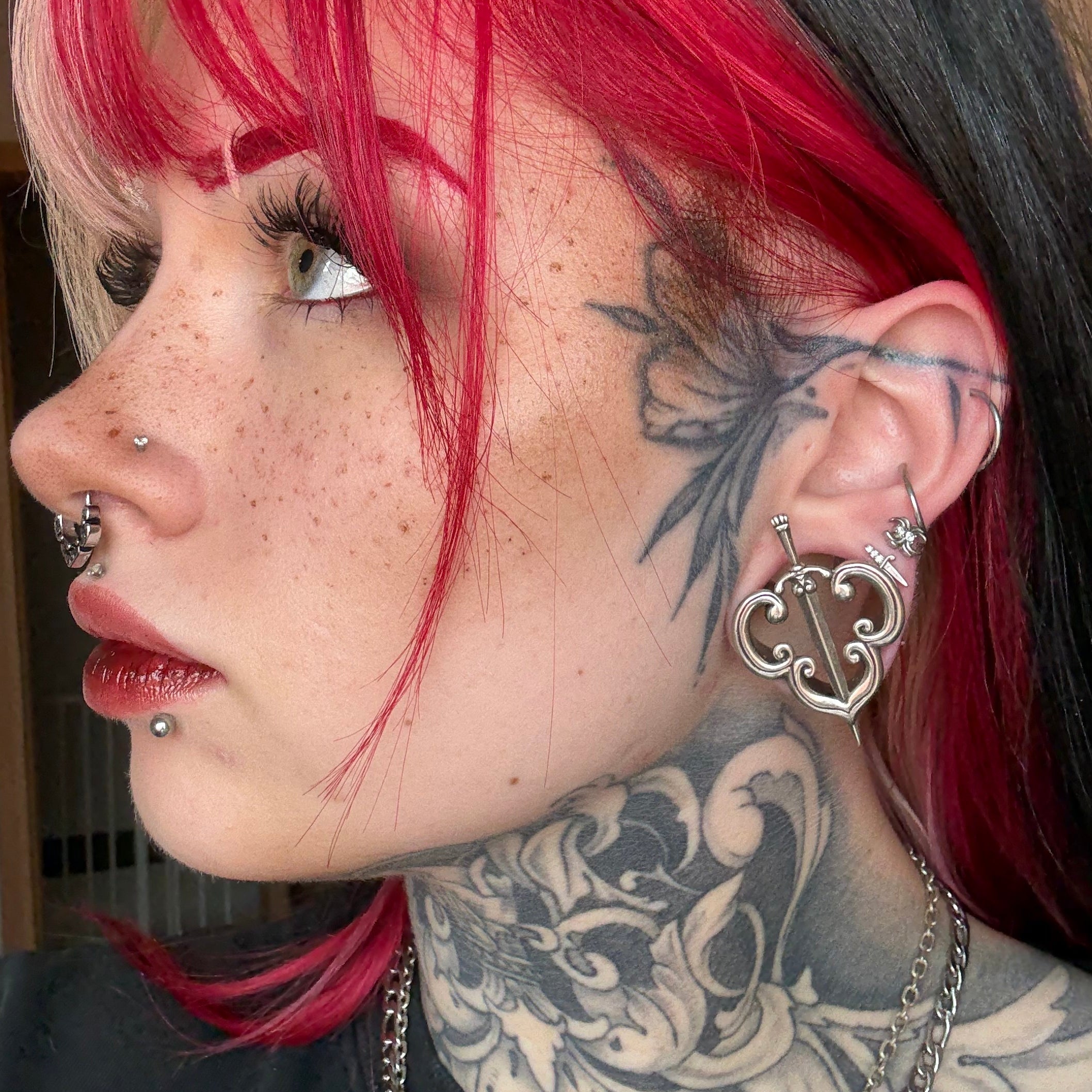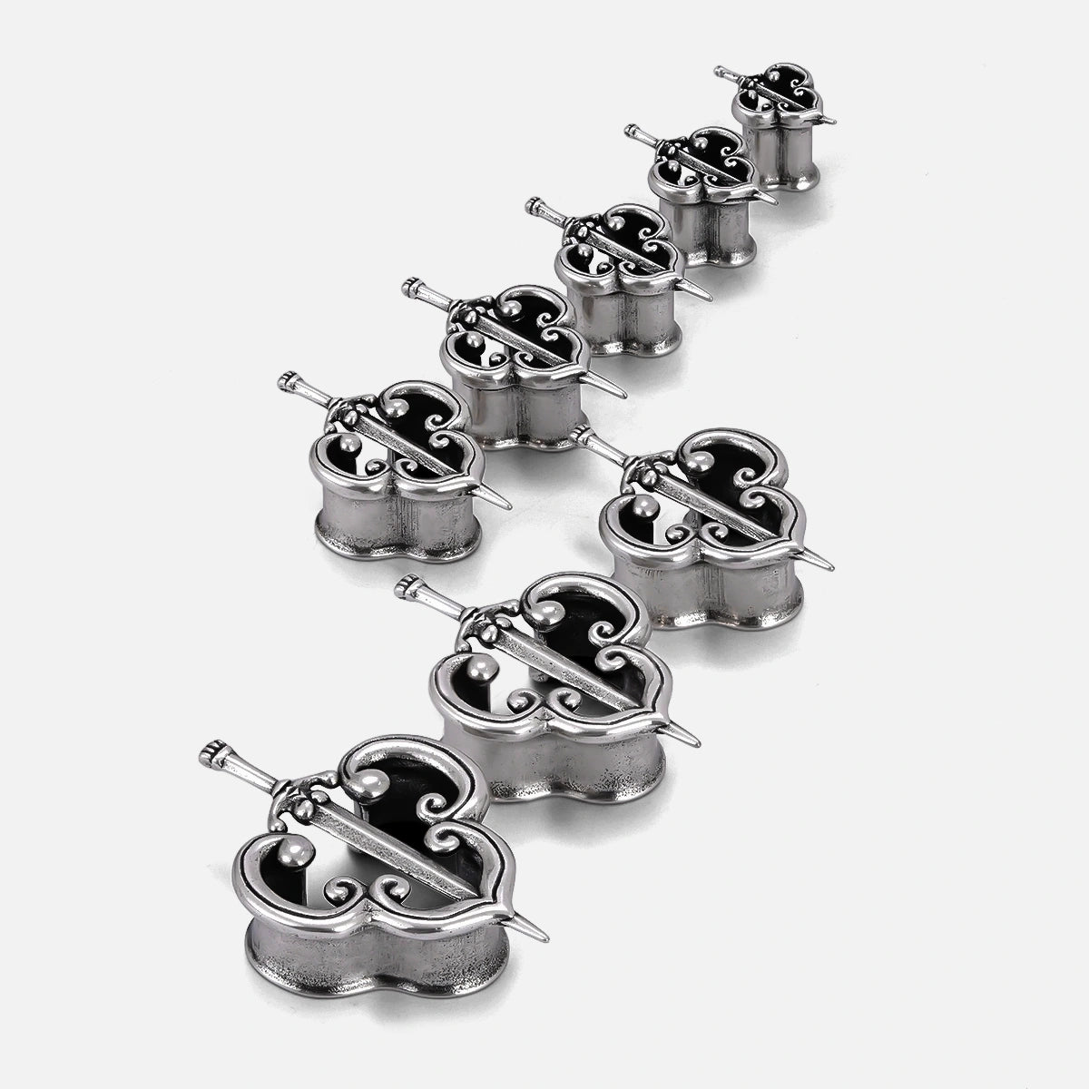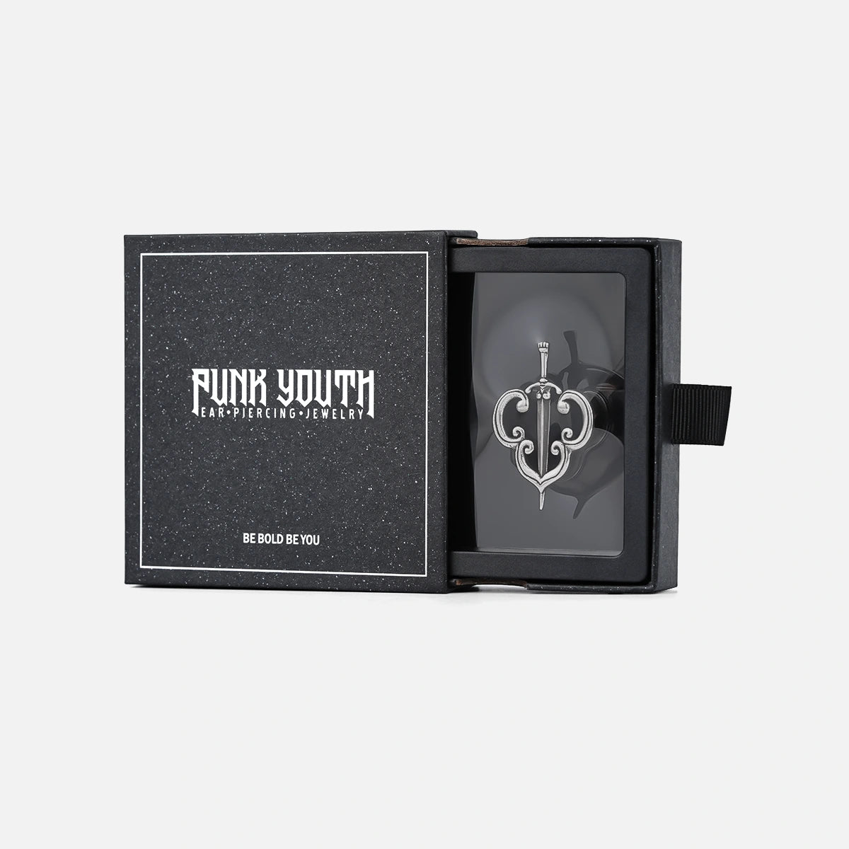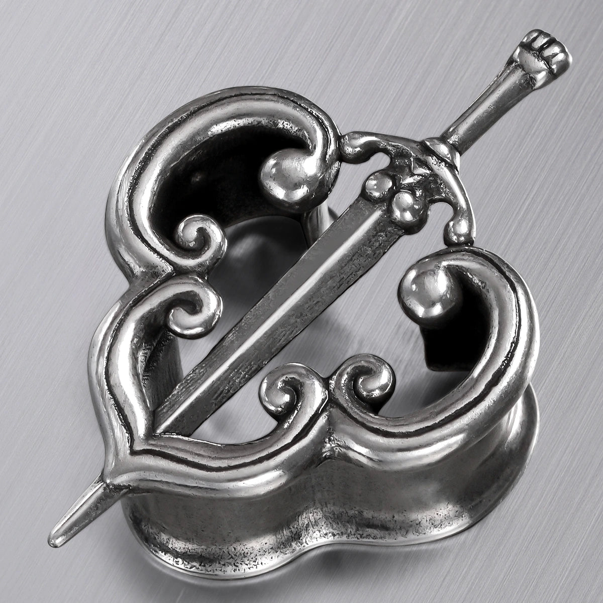 Crafted in antique silver and gold tone, these tunnels feature a sacred sword set within a baroque-style crest, merging power and elegance. This item is sold as a pair.