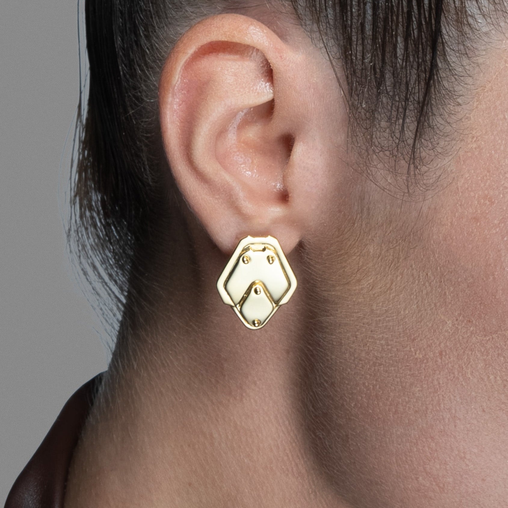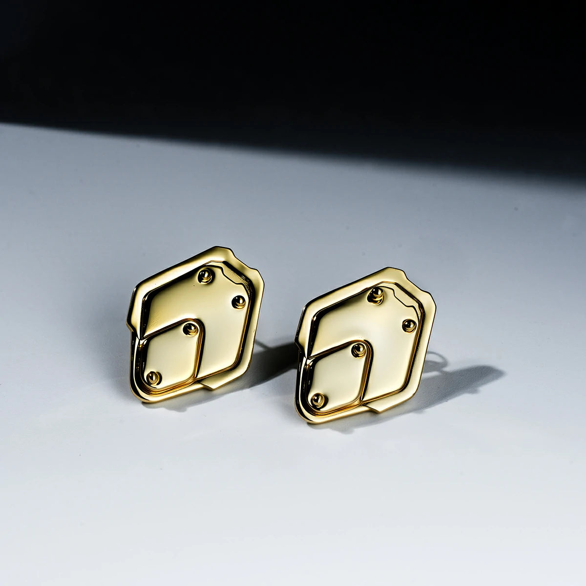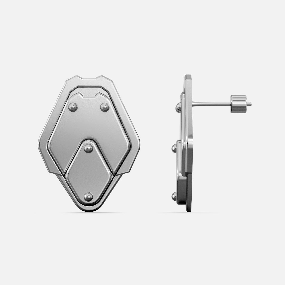The Shield Plate Stud Earrings sit on the lobe like compact armor plates—flat facets anchored with clean rivet lines. Minimal yet structural, they read as protective and exact.