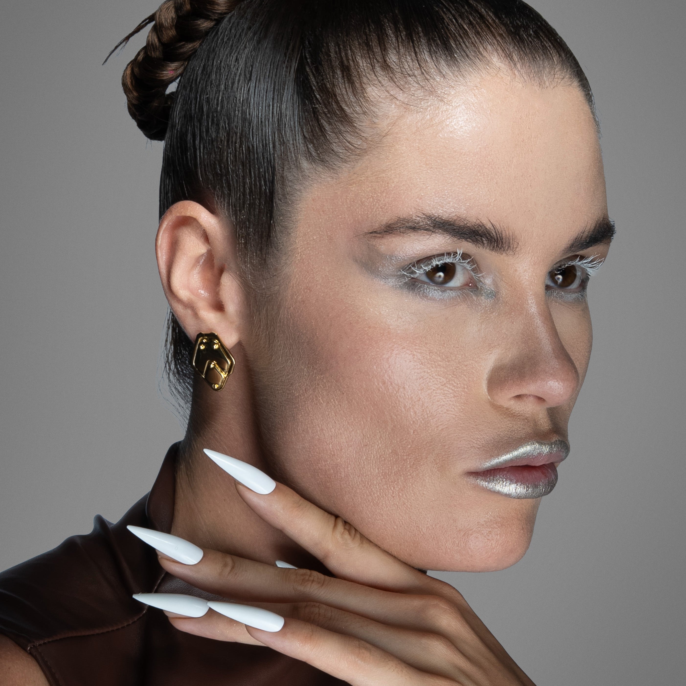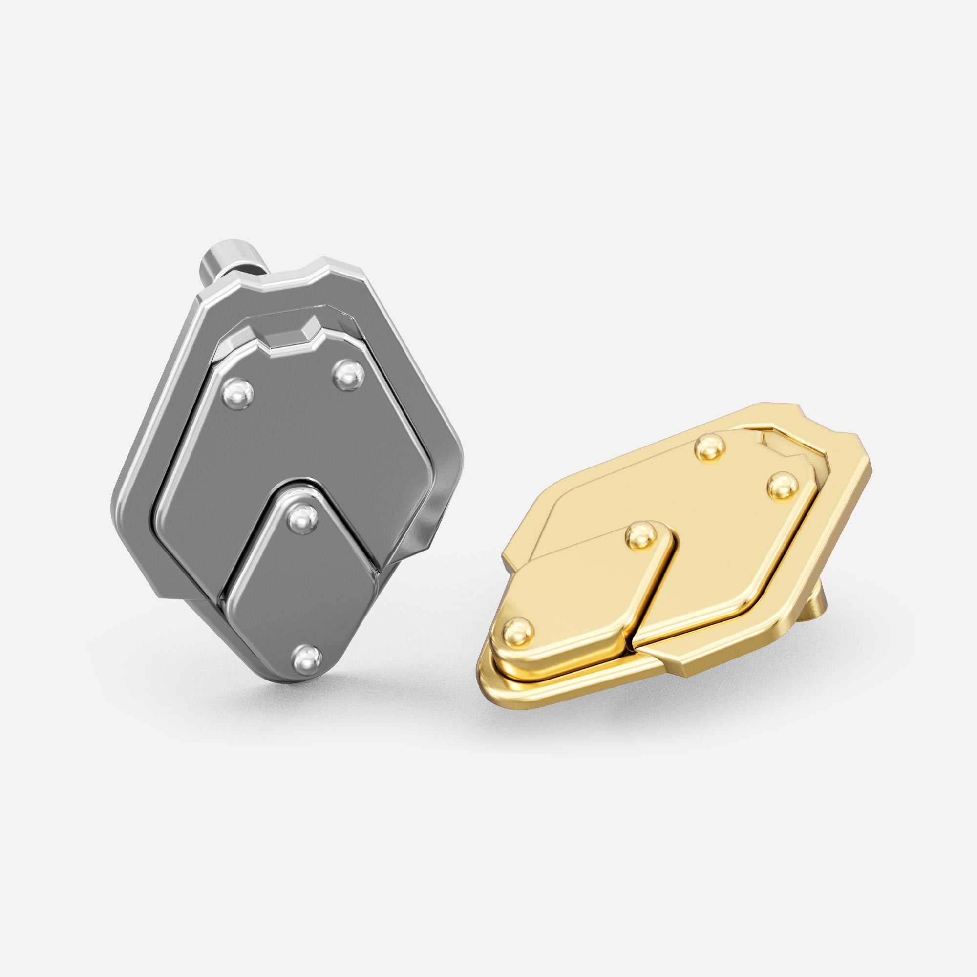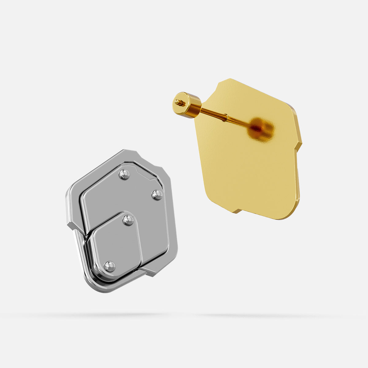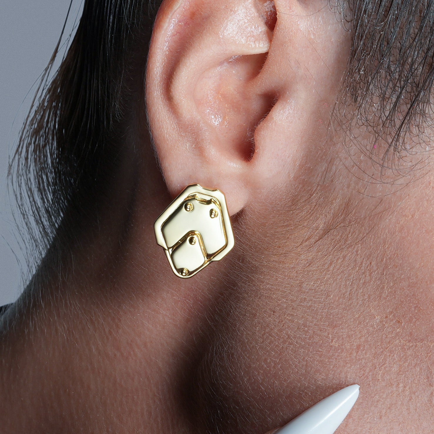 The Shield Plate Stud Earrings sit on the lobe like compact armor plates—flat facets anchored with clean rivet lines. Minimal yet structural, they read as protective and exact.