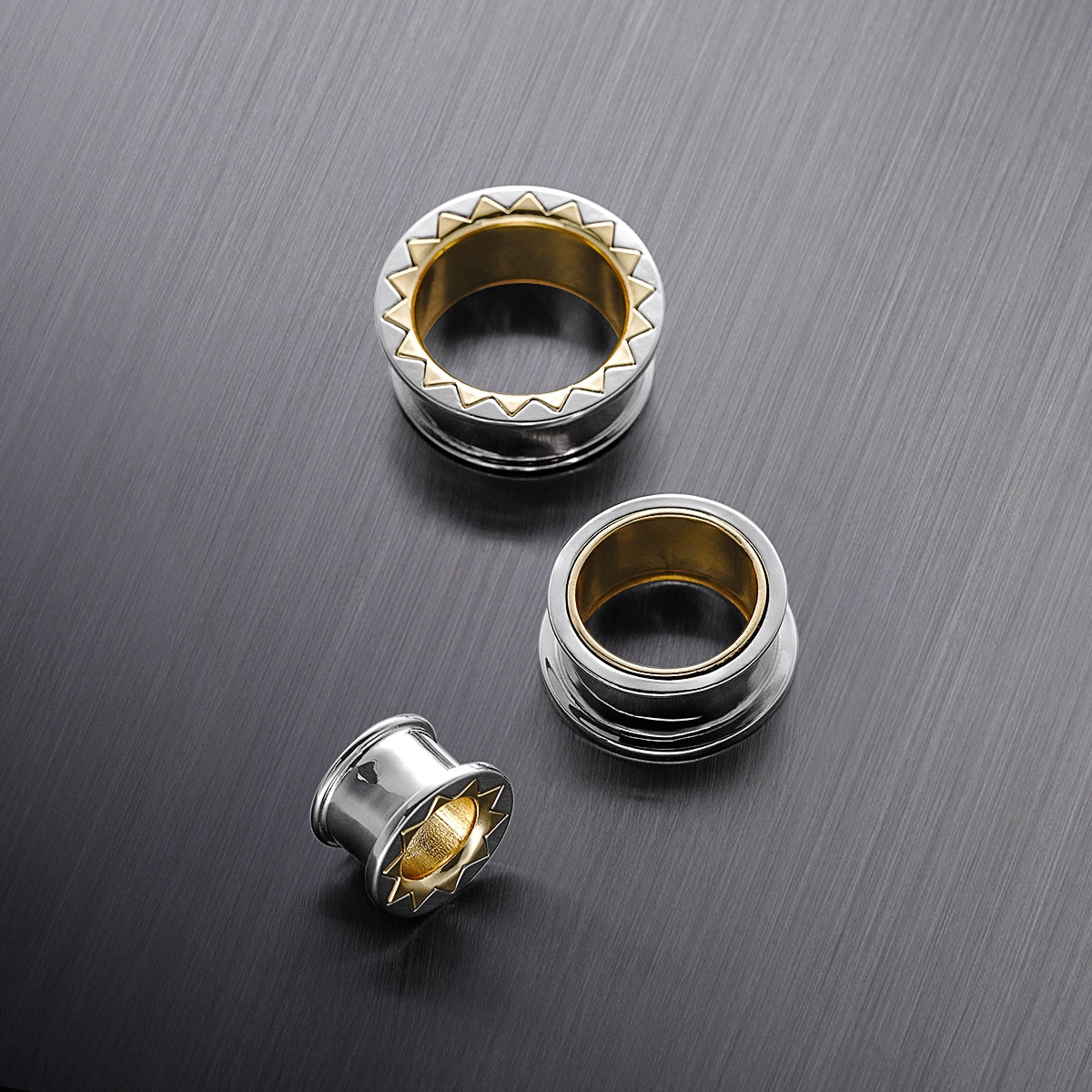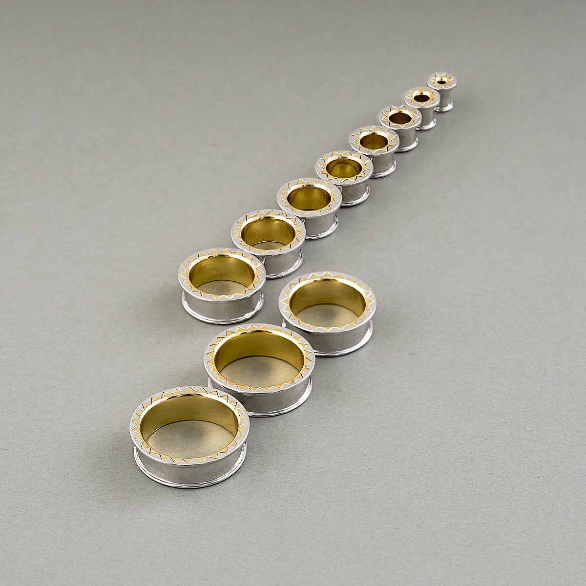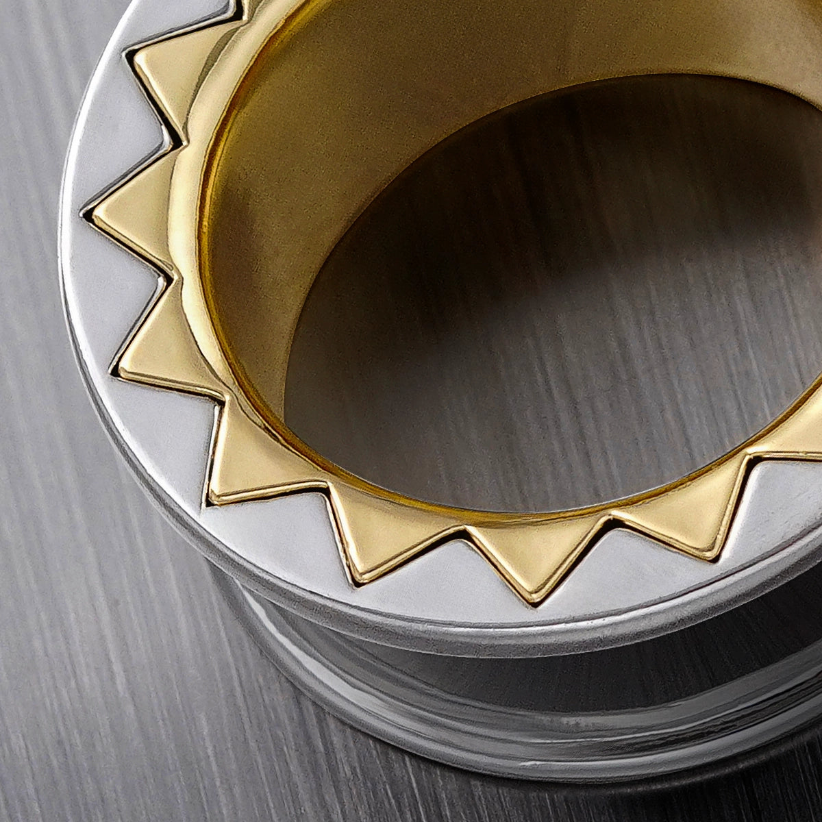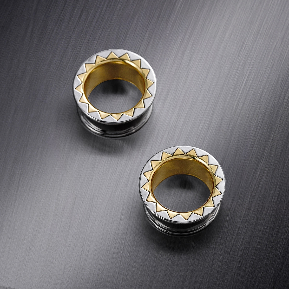 Silver and gold tunnels with a dynamic zigzag edge, these pieces make a bold statement. This item is sold as a pair.