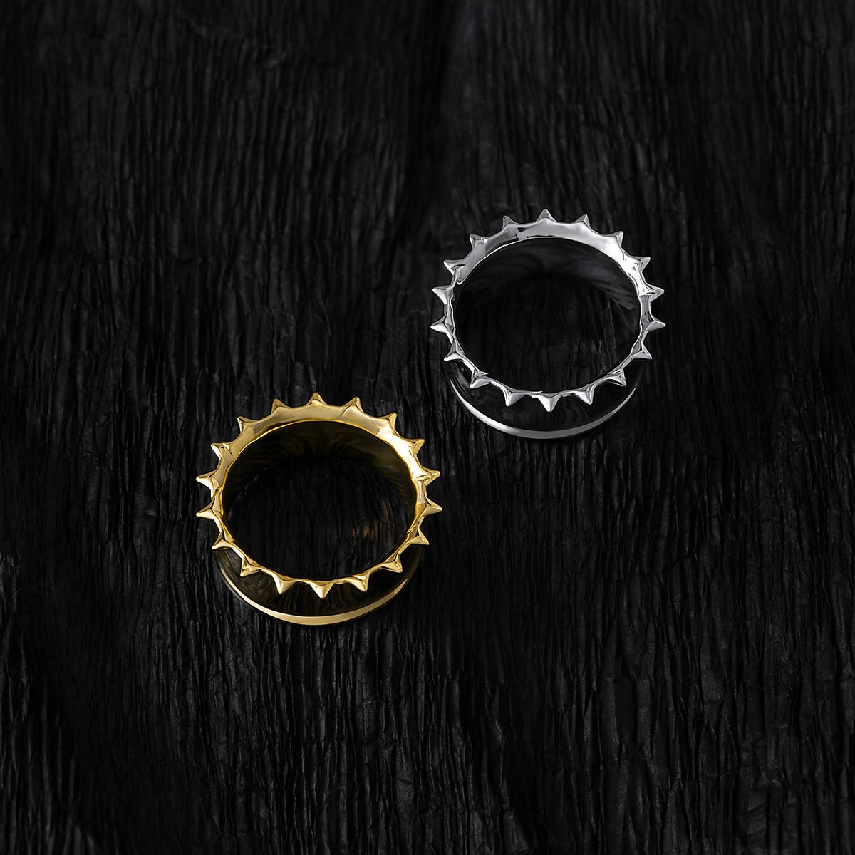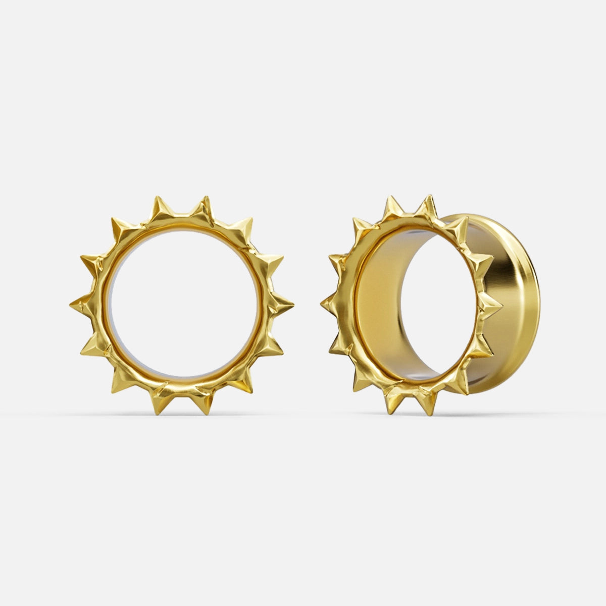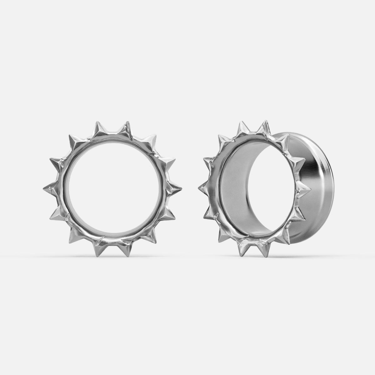 Solar Spike Tunnels feature sleek metal lines that resemble solar rays. This design captures the essence of ancient sun myths, symbolizing boundless energy and vitality. This item is sold as a pair.