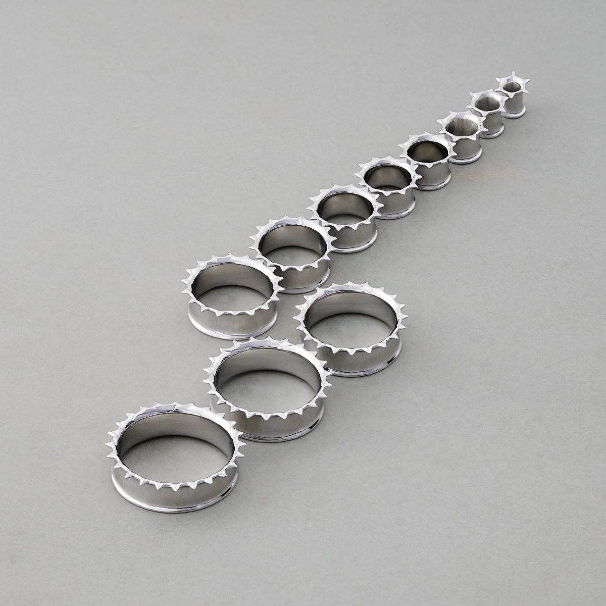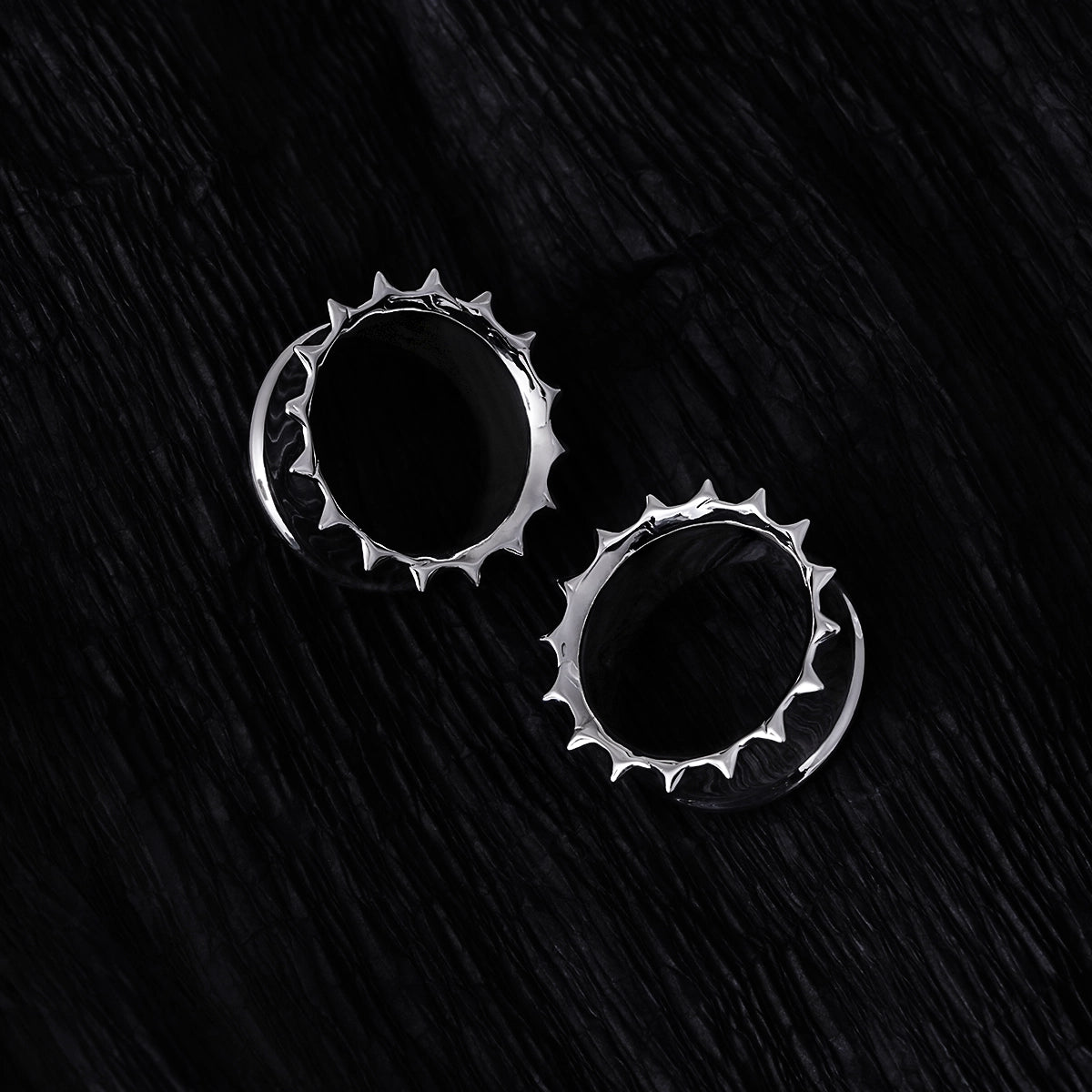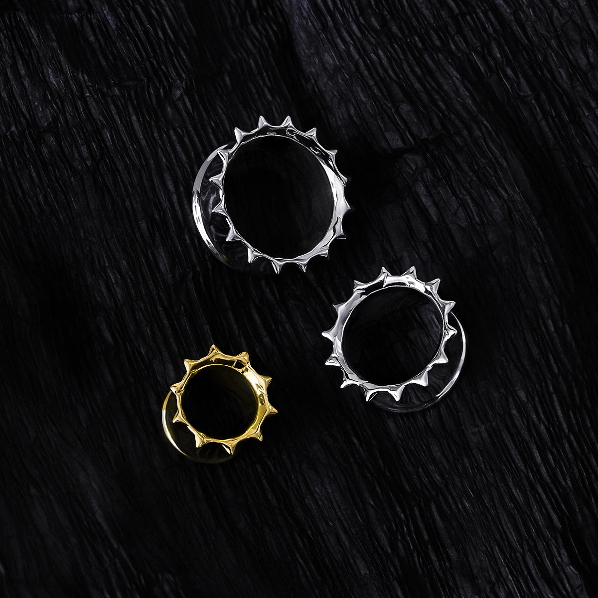 Solar Spike Tunnels feature sleek metal lines that resemble solar rays. This design captures the essence of ancient sun myths, symbolizing boundless energy and vitality. This item is sold as a pair.