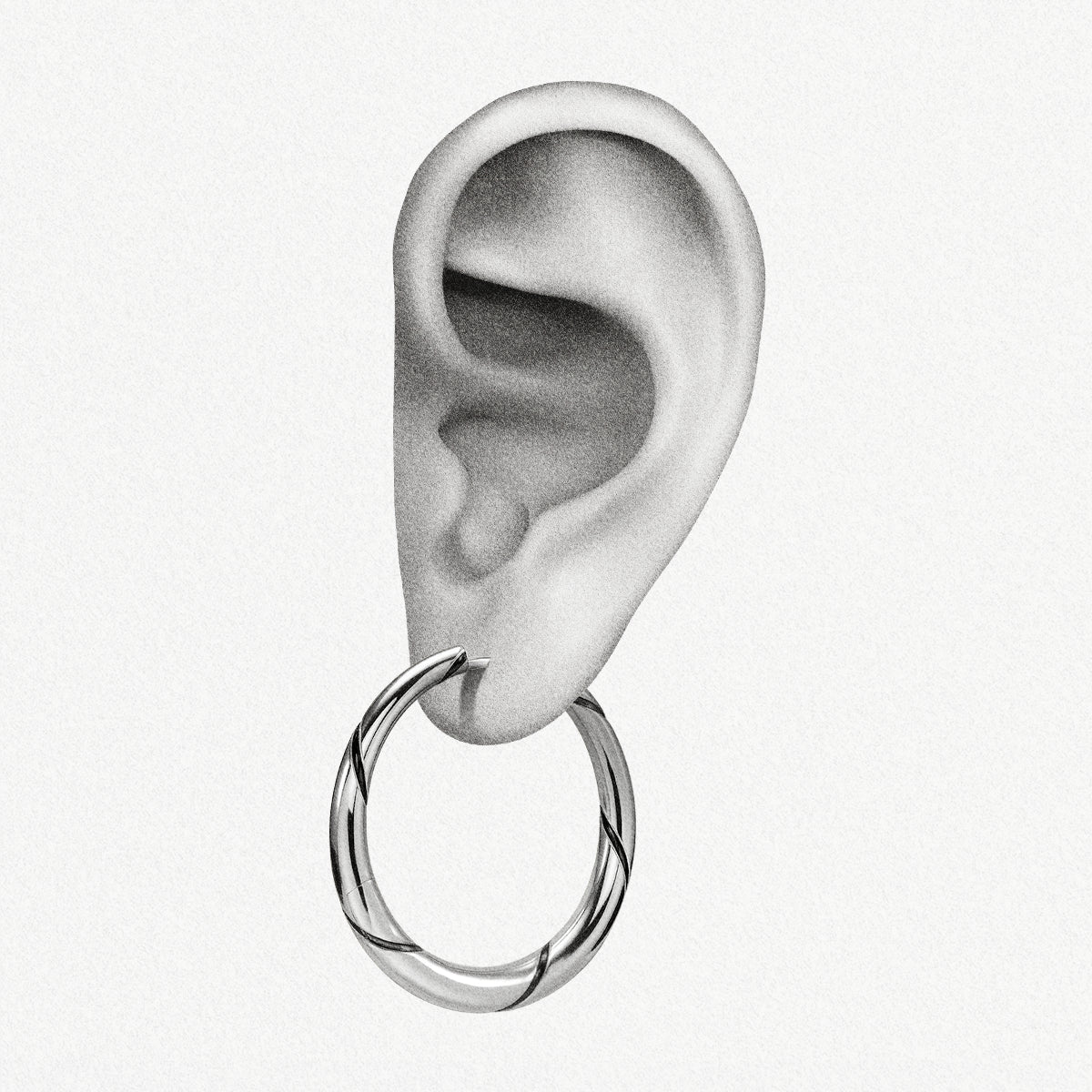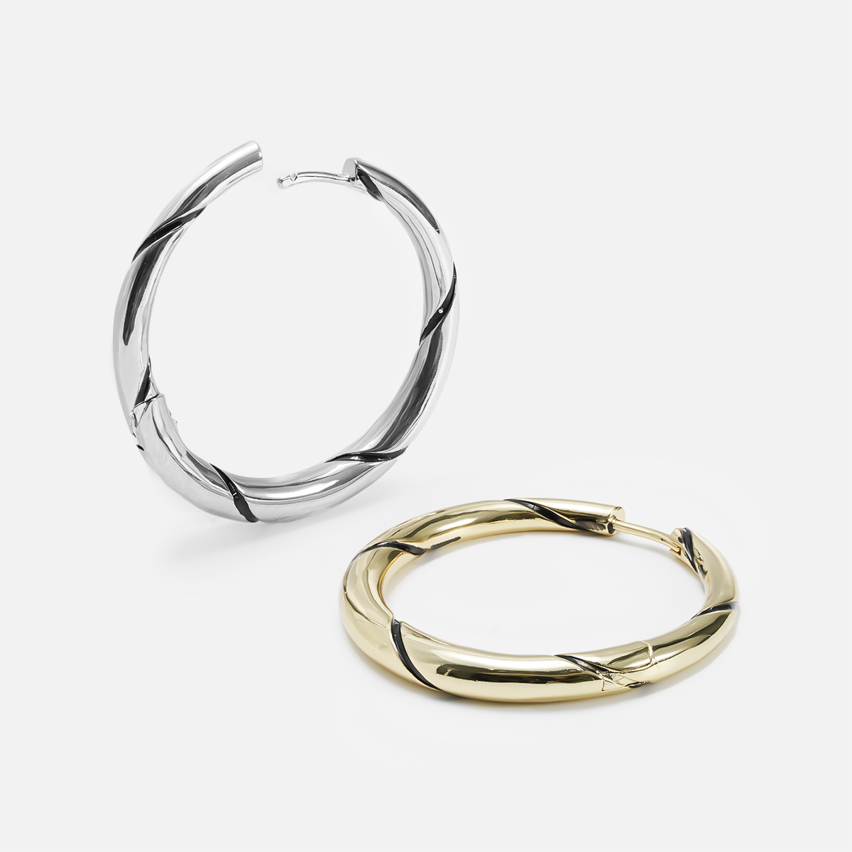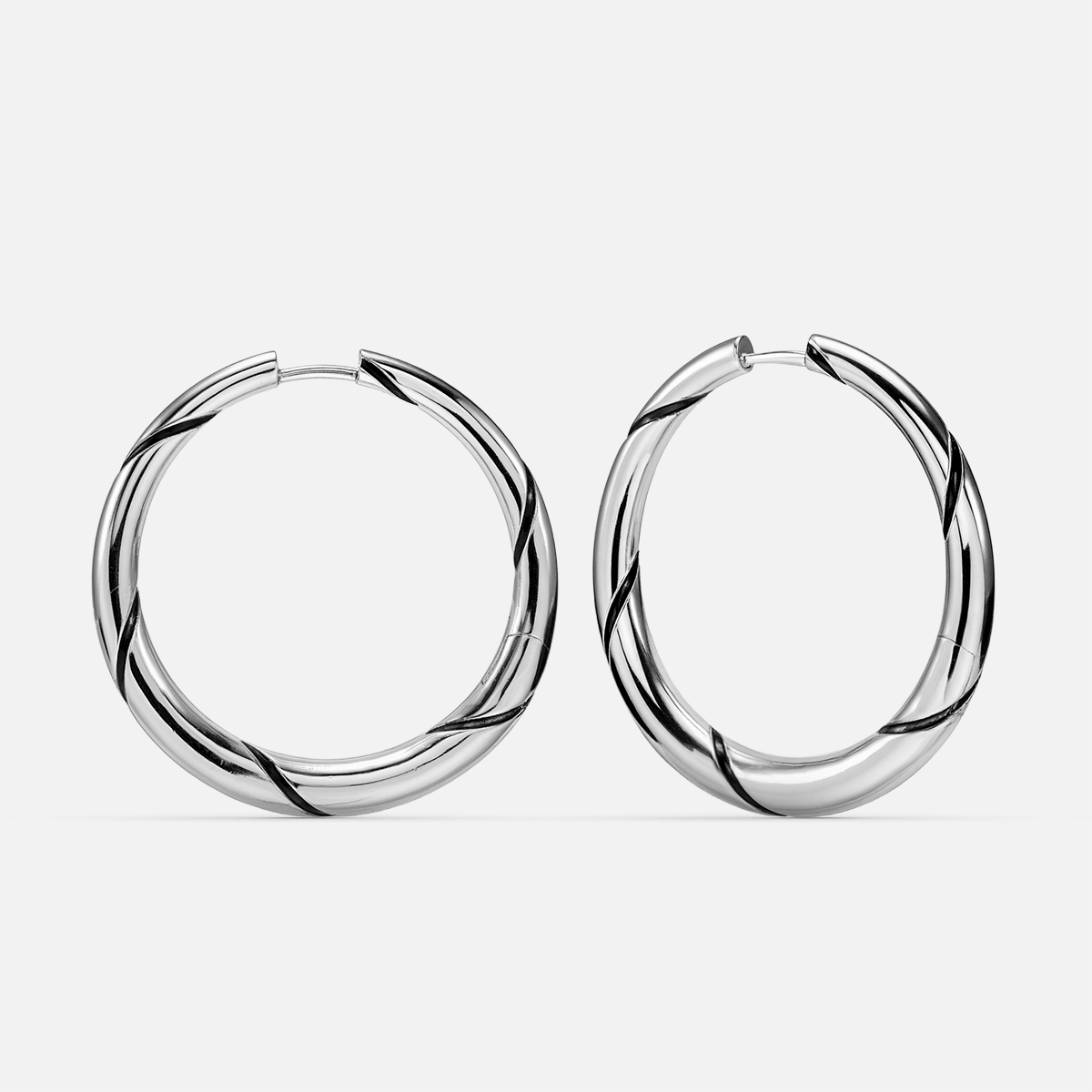 Spiral Dance Earrings feature a polished silver hoop wrapped in a fluid, twisted design—lightweight yet bold, perfect for lobe piercings. This item is sold as a pair.