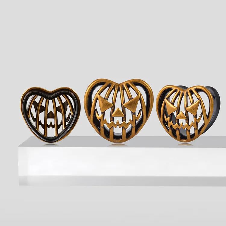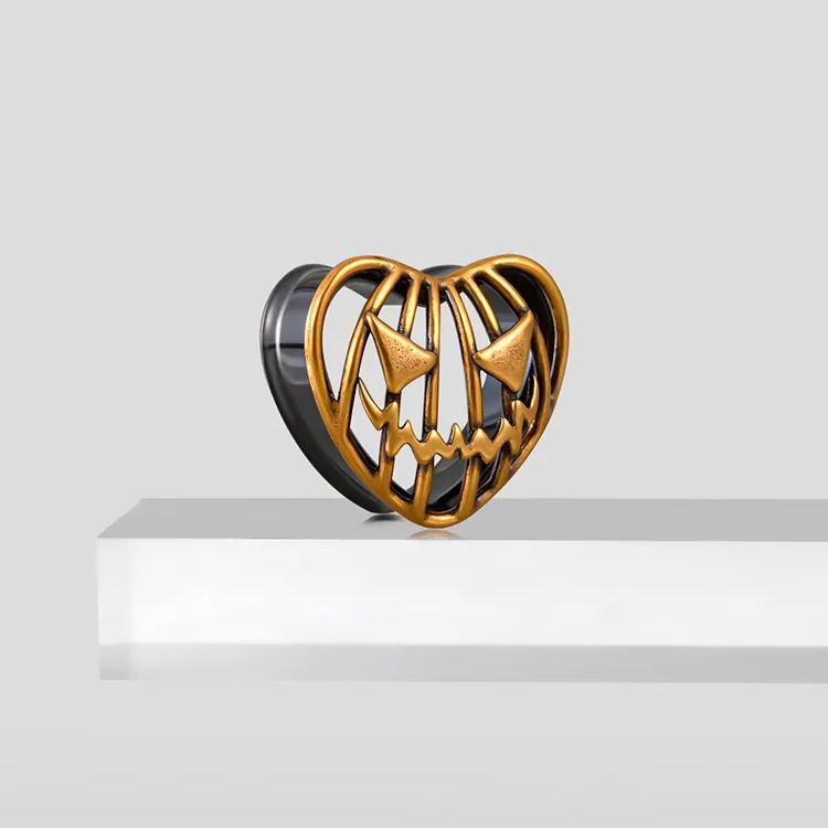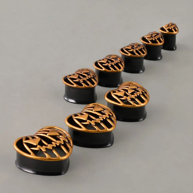 Spooky Jack TUNNELS feature a vintage copper finish with a carved Jack-o'-lantern face. The detailed design includes sharp triangular eyes and a jagged mouth.This item is sold as a pair.