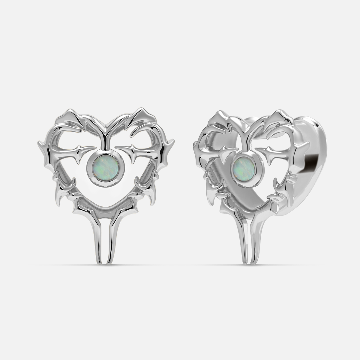 Polished silver-tone tunnels shaped like hearts, wrapped in thorn-like edges with a glowing opal at the center. This item is sold as a pair.