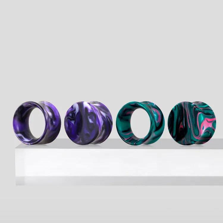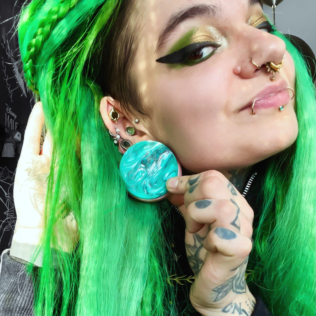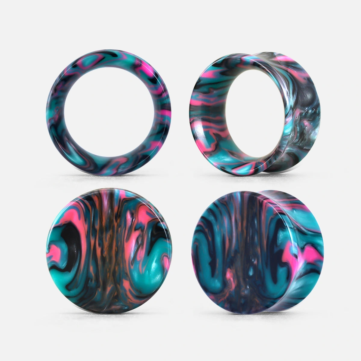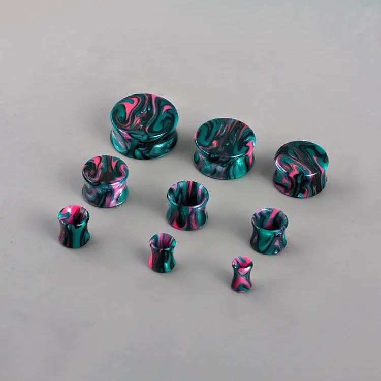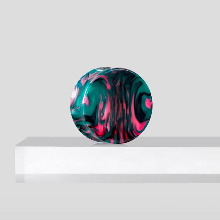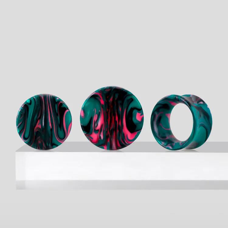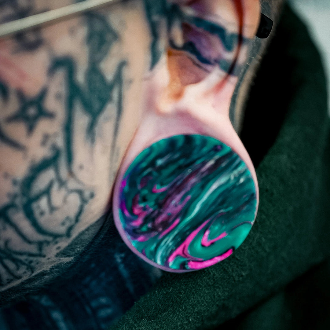 These vibrant marble plugs feature a striking combination of green and pink hues with a smooth, flowing pattern, reminiscent of natural marble.This item is sold as a pair.