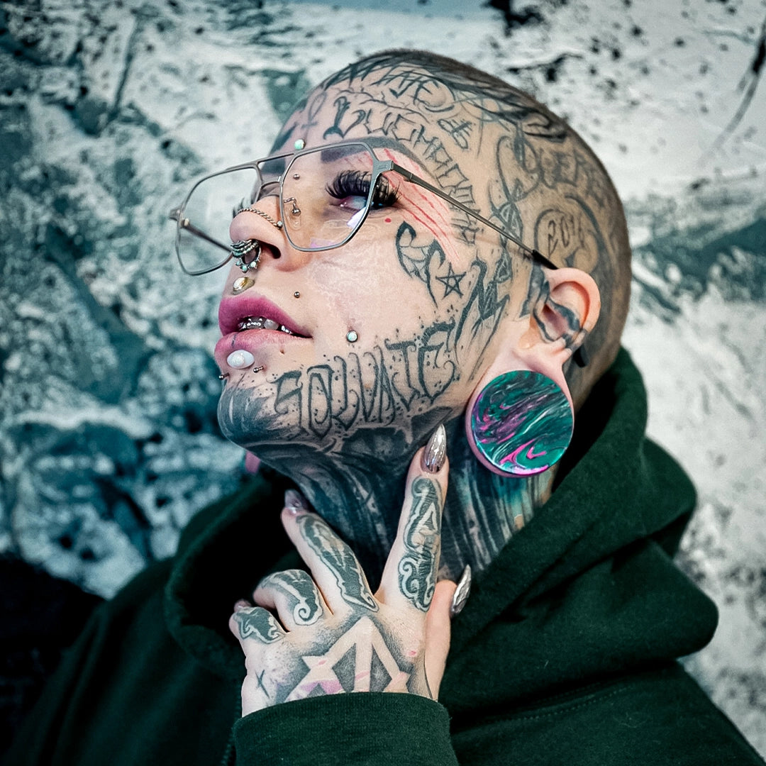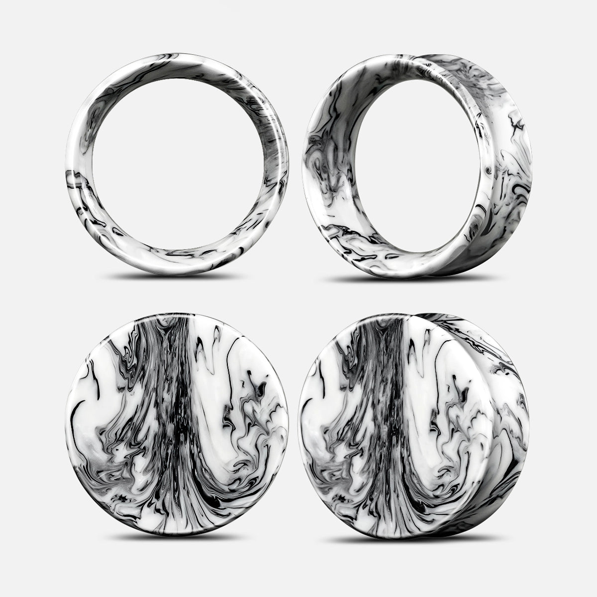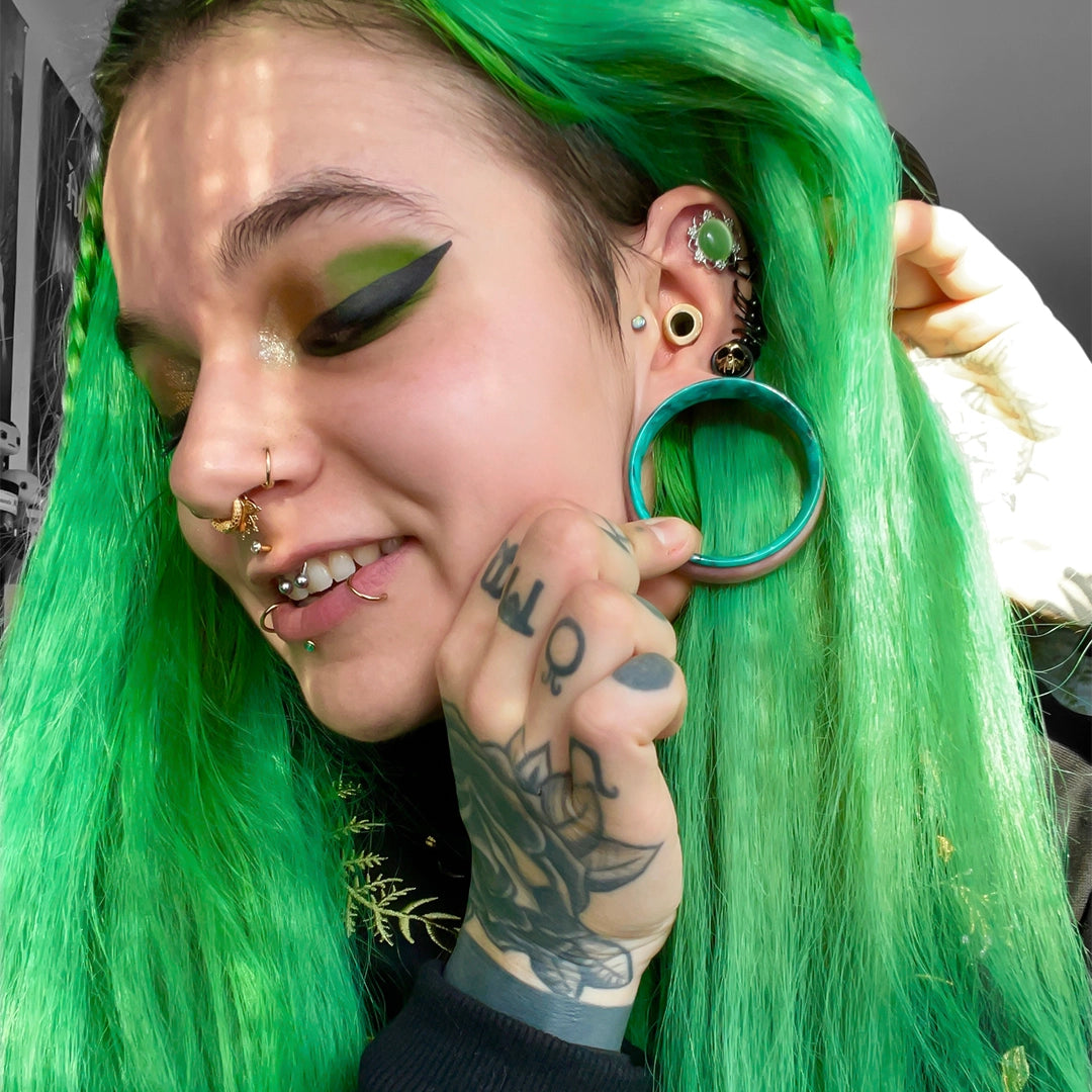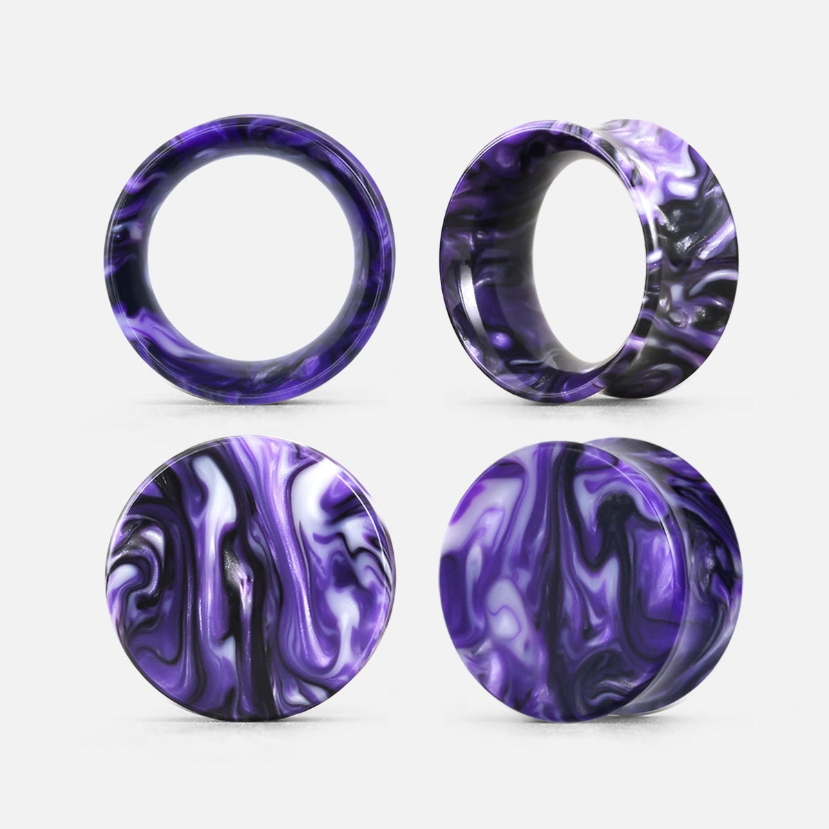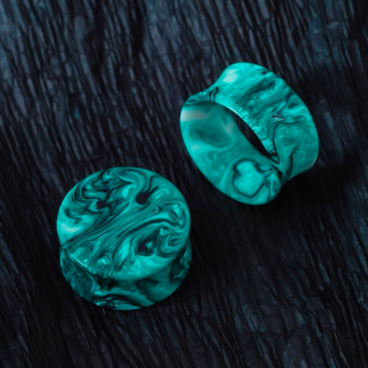 These vibrant marble plugs feature a striking combination of green and pink hues with a smooth, flowing pattern, reminiscent of natural marble.This item is sold as a pair.