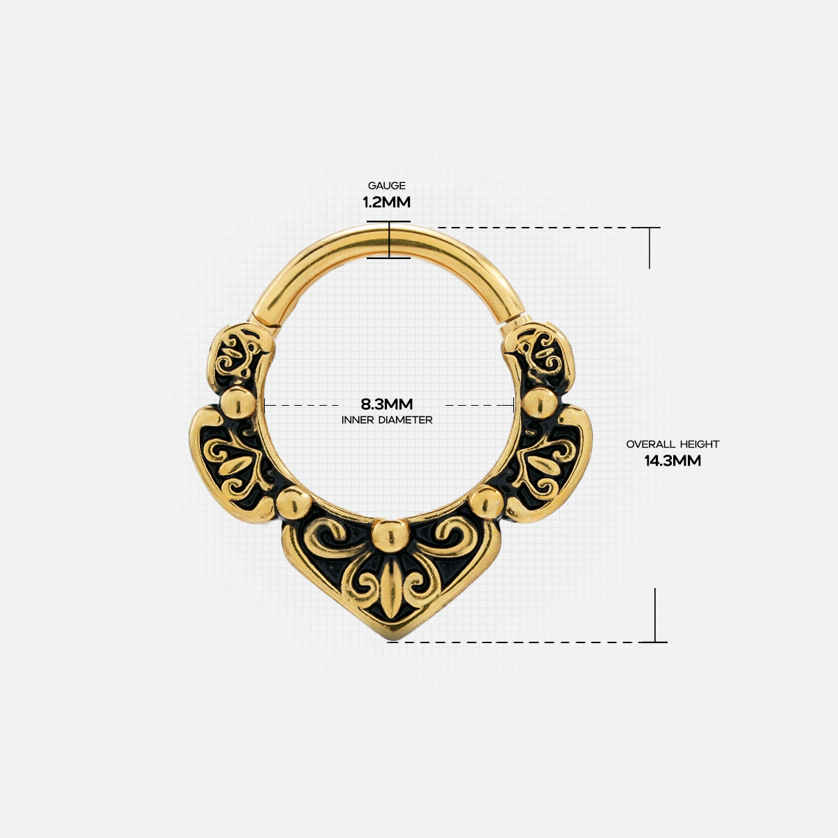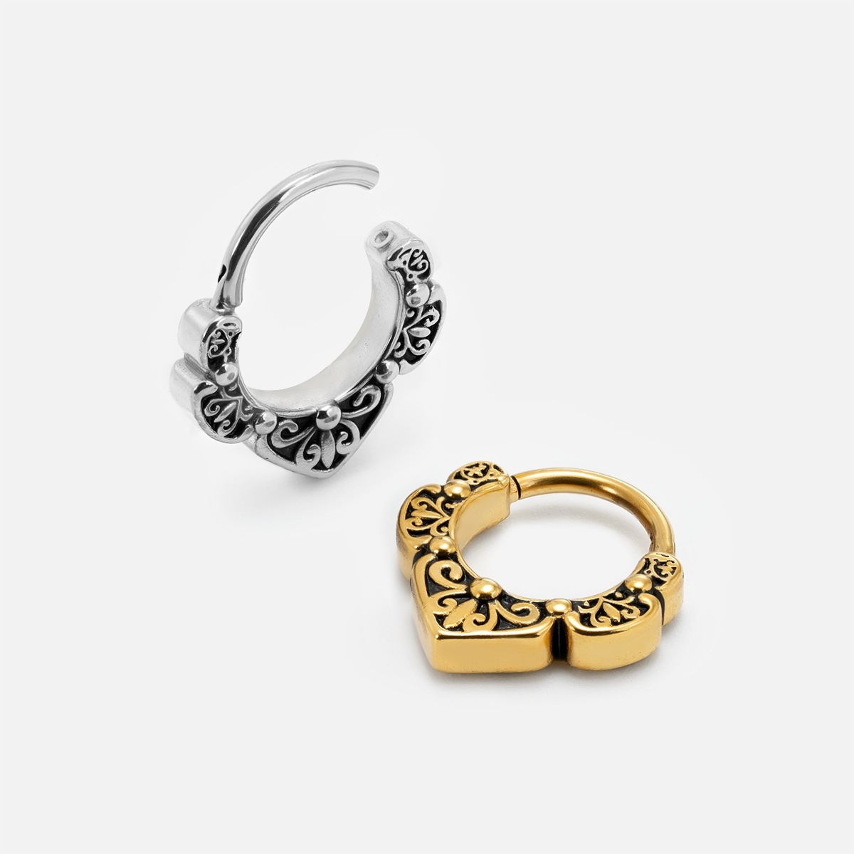 Victorian Bloom Septum Clicker features a sculpted hoop with intricate floral motifs inspired by antique ornamental metalwork, available in gold or silver finish. This item is sold individually.
