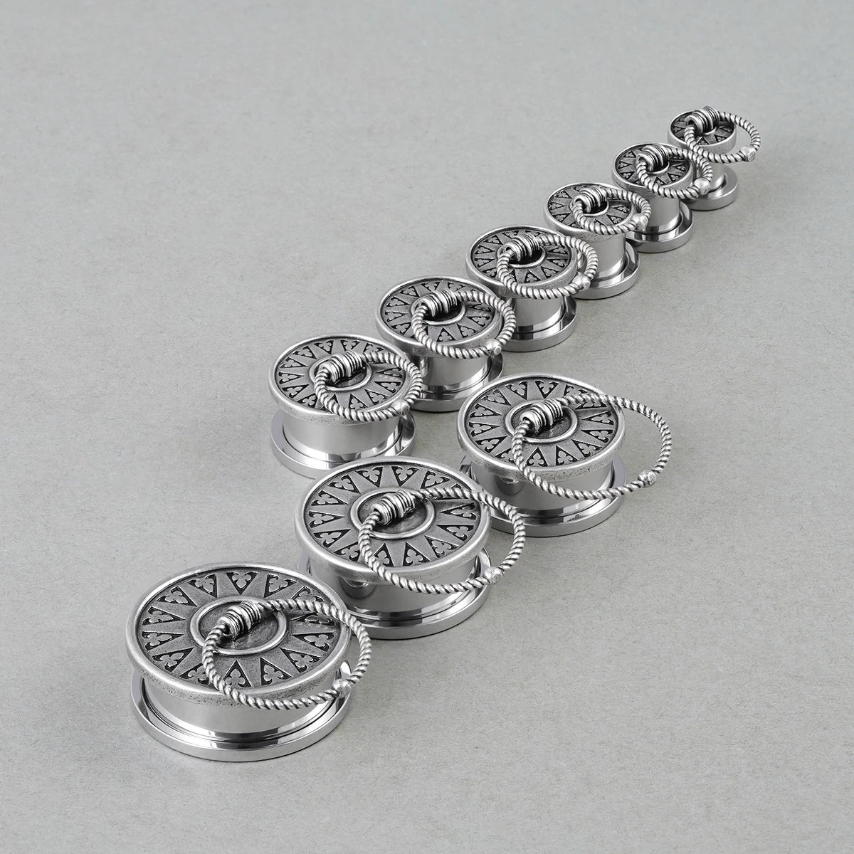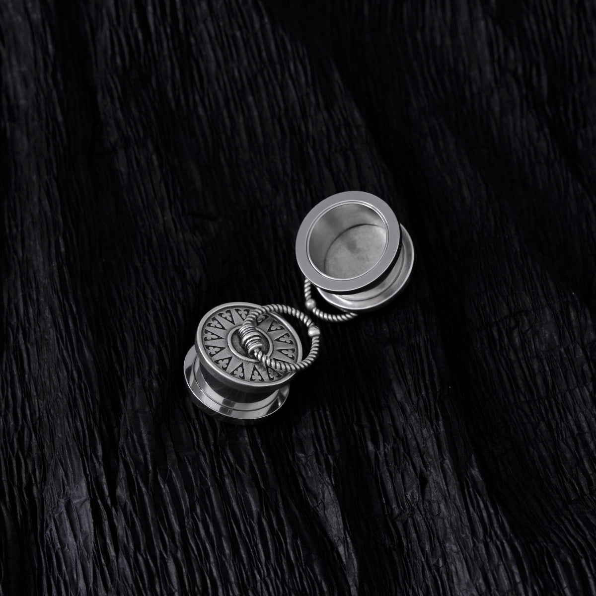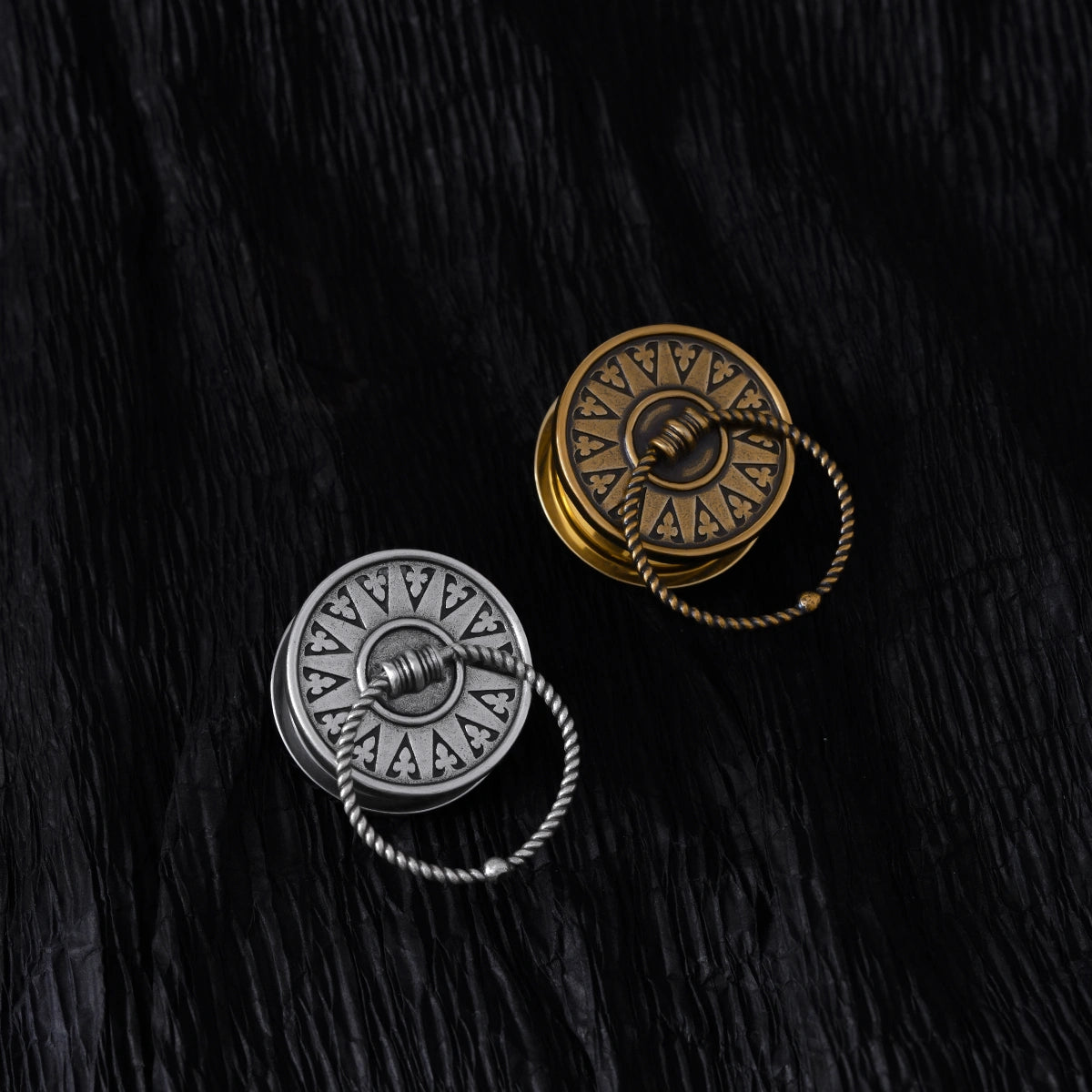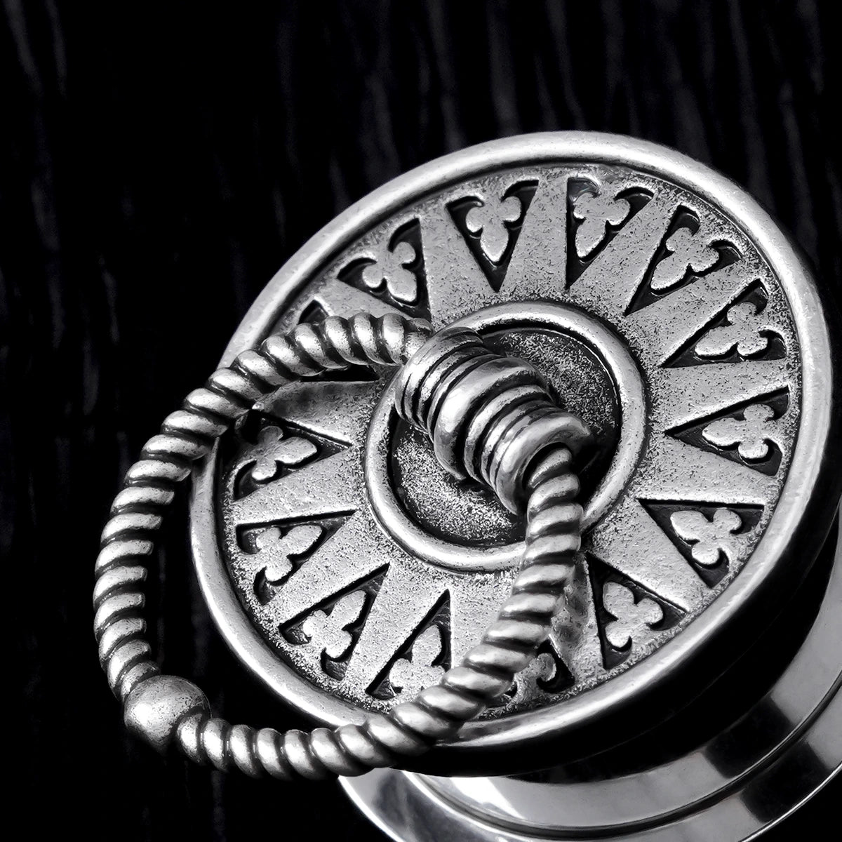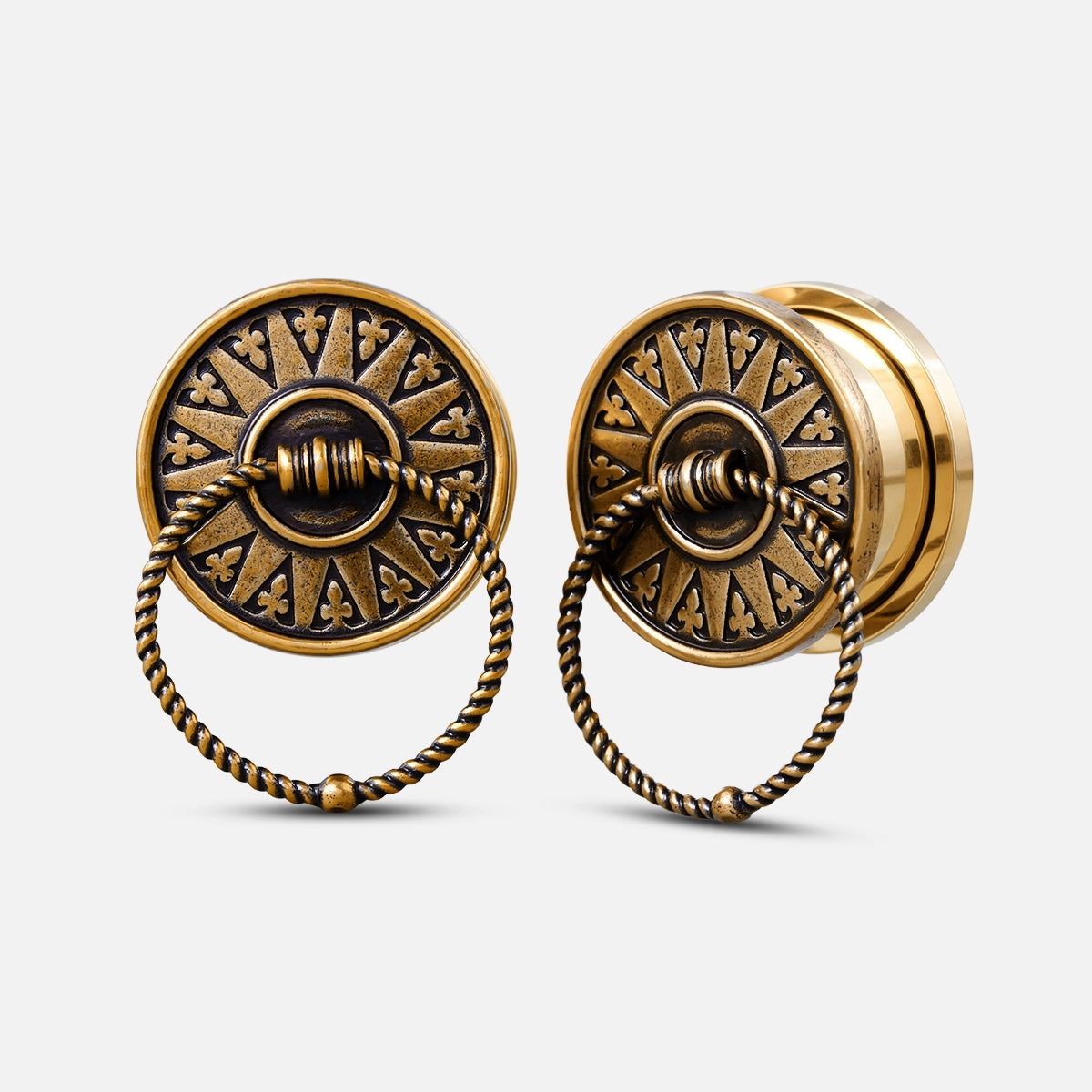 These plugs feature a circular design with intricate gothic patterns and a central door knocker element, offering a bold, vintage aesthetic. This item is sold as a pair.